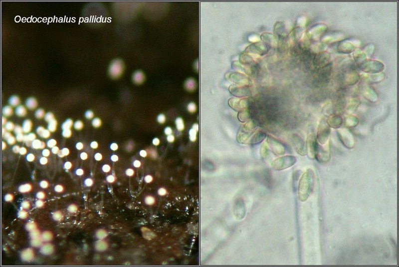 Winzigen Laternen gleich leuchten im Licht der Stereolupe die Sporenträger von Oedocephalus pallidus. Die Sporen werden an einem kugeligen Köpfchen gebildet und sind fein rau. Leider kann man das auf meiner Mikroaufnahme nicht erkennen.