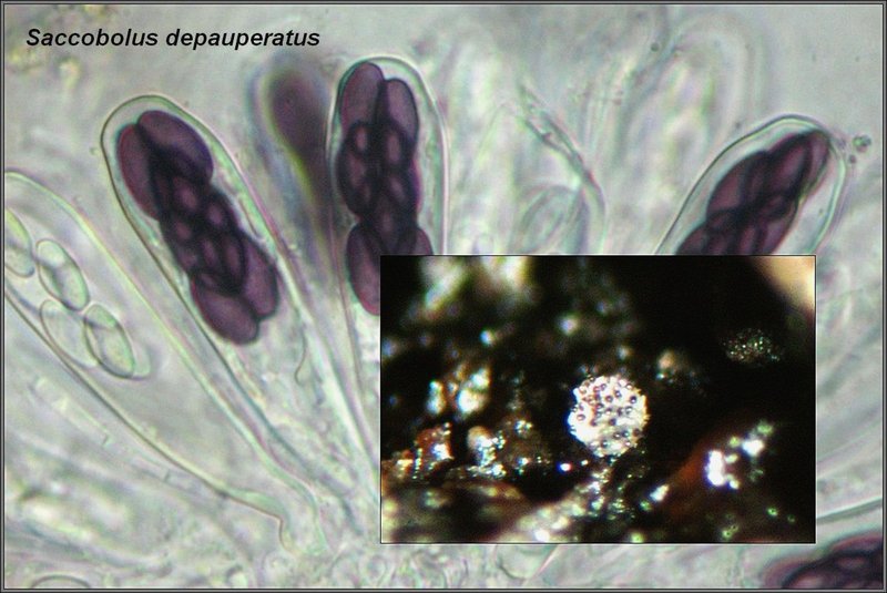 Deutlich violett punktiert sind die unauffälligen Fruchtkörper der Gattung Saccobolus, die meist nicht größer als einen halben Millimeter werden und die man oft erst entdeckt, wenn sie in größerer Anzahl auftreten. Als Besonderheit sind deren Sporen stets zu einem festen Gefüge vereint, welches von Art zu Art verschieden sein kann. Die violetten Punkte, die wir wahrnehmen, sind genau diese Sporenbündel.