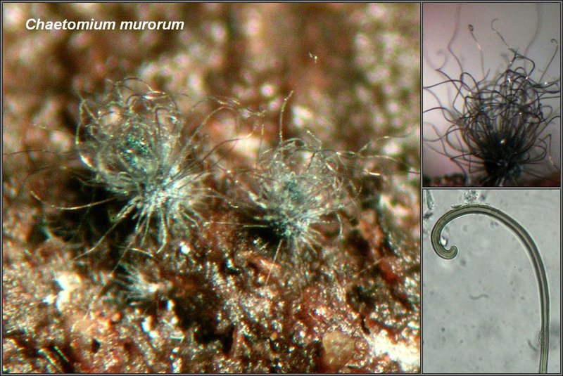 Perückenkugelpilze nennt Peter W. die kleinen Fruchtkörper der Gattung Chaetomium wohl wegen ihrer bizarren –žFrisuren–œ. Die auffälligen Haare können u.a. spiralig gedreht, mehrfach verzweigt oder an den Enden spazierstockartig gekrümmt sein, wie es bei Chaetomium murorum der Fall ist.
