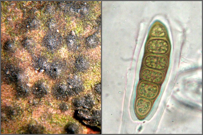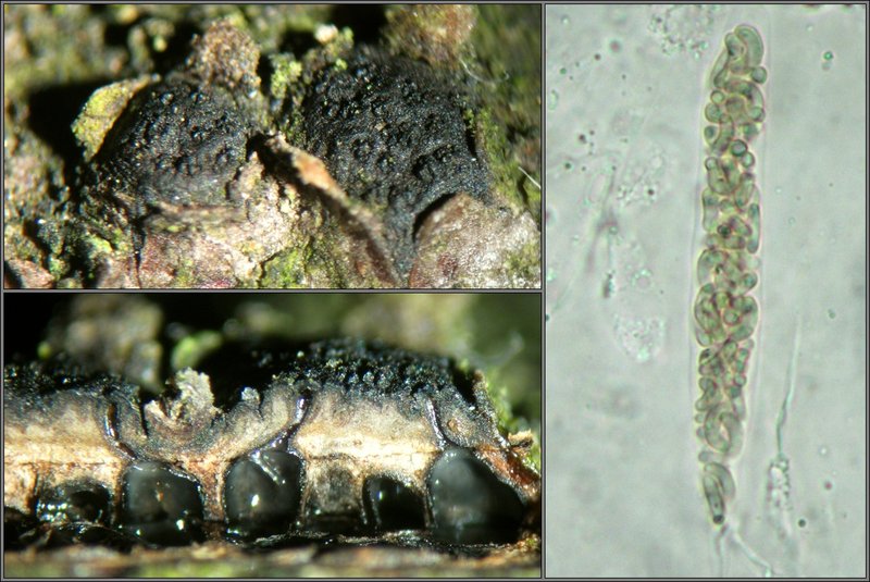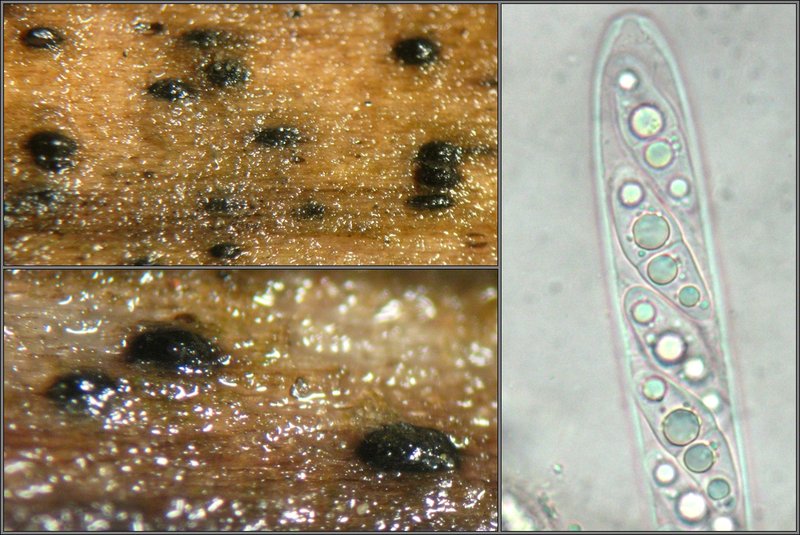Dieser Pilz, auch als Massaria-Krankheit bekannt und gefürchtet, schädigt vor allem dünne Äste im Kronenbereich der Platanen so stark, dass sie abbbrechen. Die Fruchtkörper findet man dann auch meist im Bereich der Bruchstellen. Oft sind die Äste von den hübschen Sporen der Nebenfruchtform (Anamorphe) regelrecht übersät.