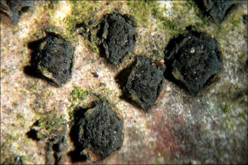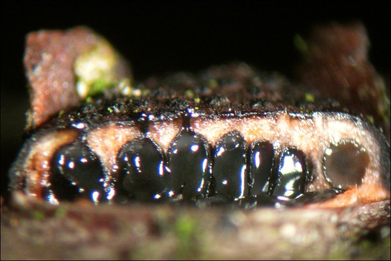 Das ebenfalls von Anna bereits vorgestellte Buchen-Eckenscheibchen (Diatrype disciformis) habe ich mir etwas genauer angeschaut und dabei entdeckt, dass die Oberfläche aussieht, als habe jemand Kreuzschlitzschrauben hineingedreht!