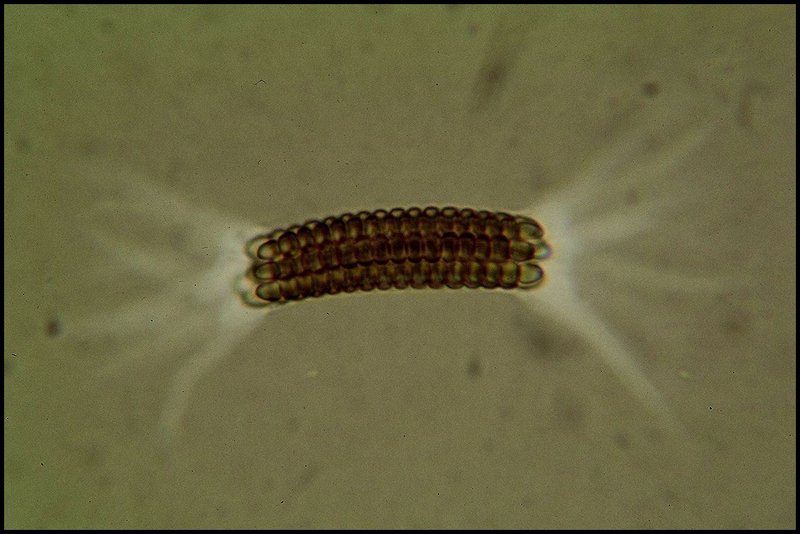 Interessant auch die Caudae, die sich langen Dornen gleich an den Polen der einelnen Sporen befinden. Das sieht in Schwarzer Tusche so aus: