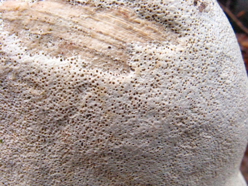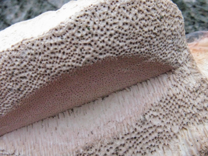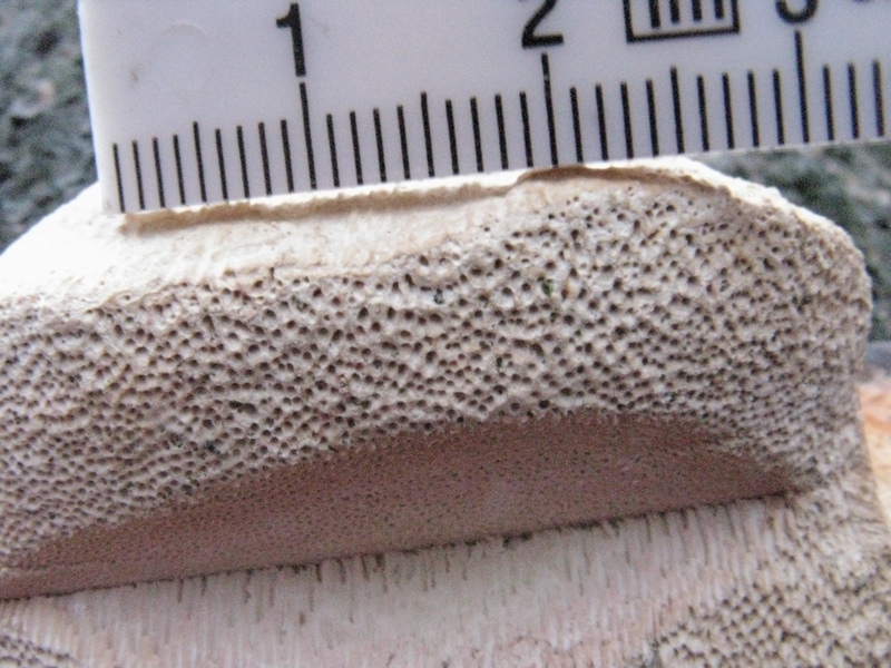 Der Pilz ist übrigens von sehr fester Konsistenz. Er läßt sich weder an der Oberseite, noch an der Porenfläche eindrücken.