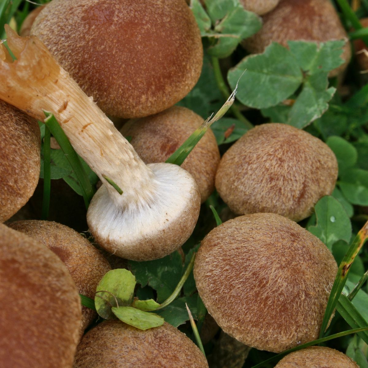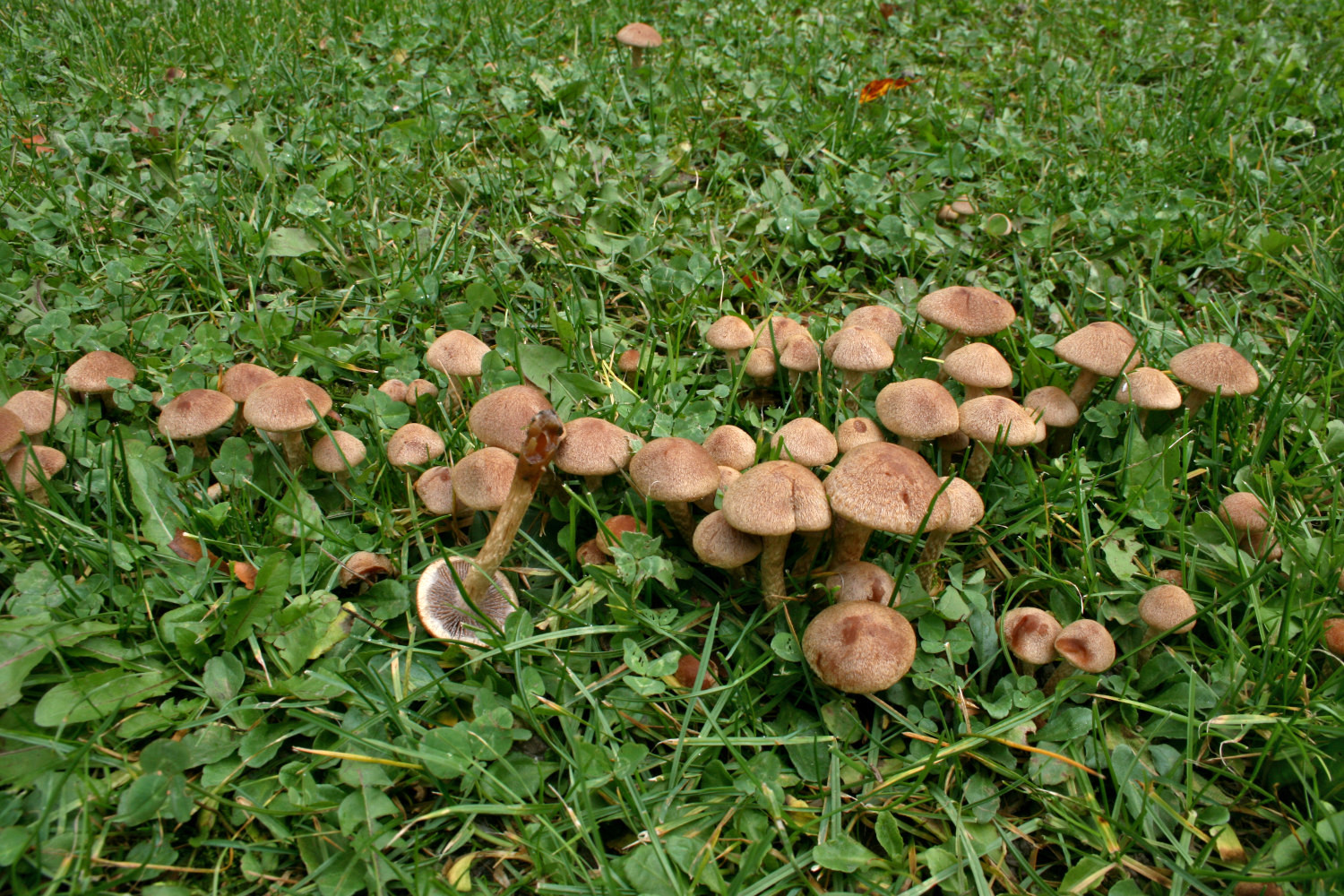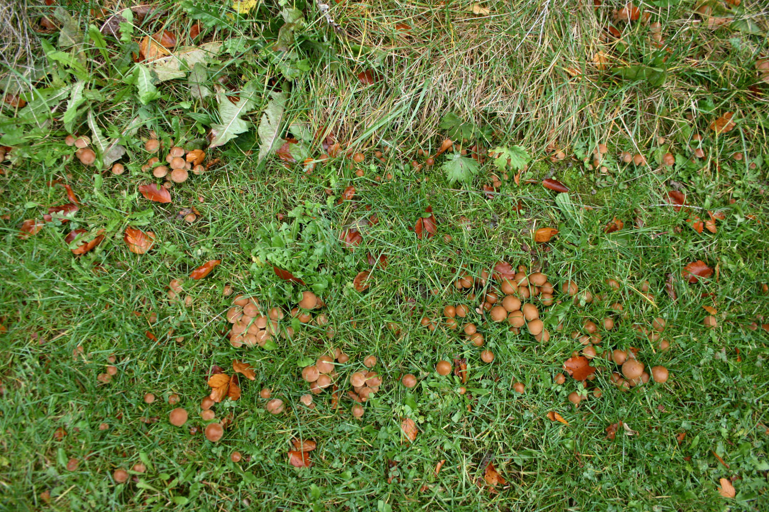 Dort gab es in irren Massen diese kleinen Saumpilze, Gruppen mit 50 – 100 Stück, alle paar Meter solche Cluster – siehe Fotos, immer eher am Rande der Wiesenfläche Richtung Waldrand, aber schon im Gras, auf mehreren Arealen rund um das Sportplatzgelände. Es sind also insgesamt etliche Tausende von Fruchtkörpern.