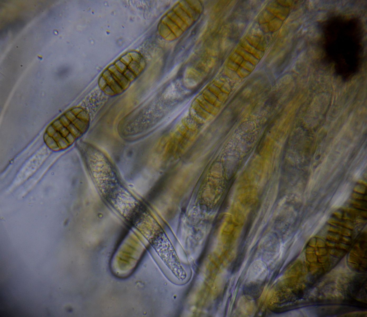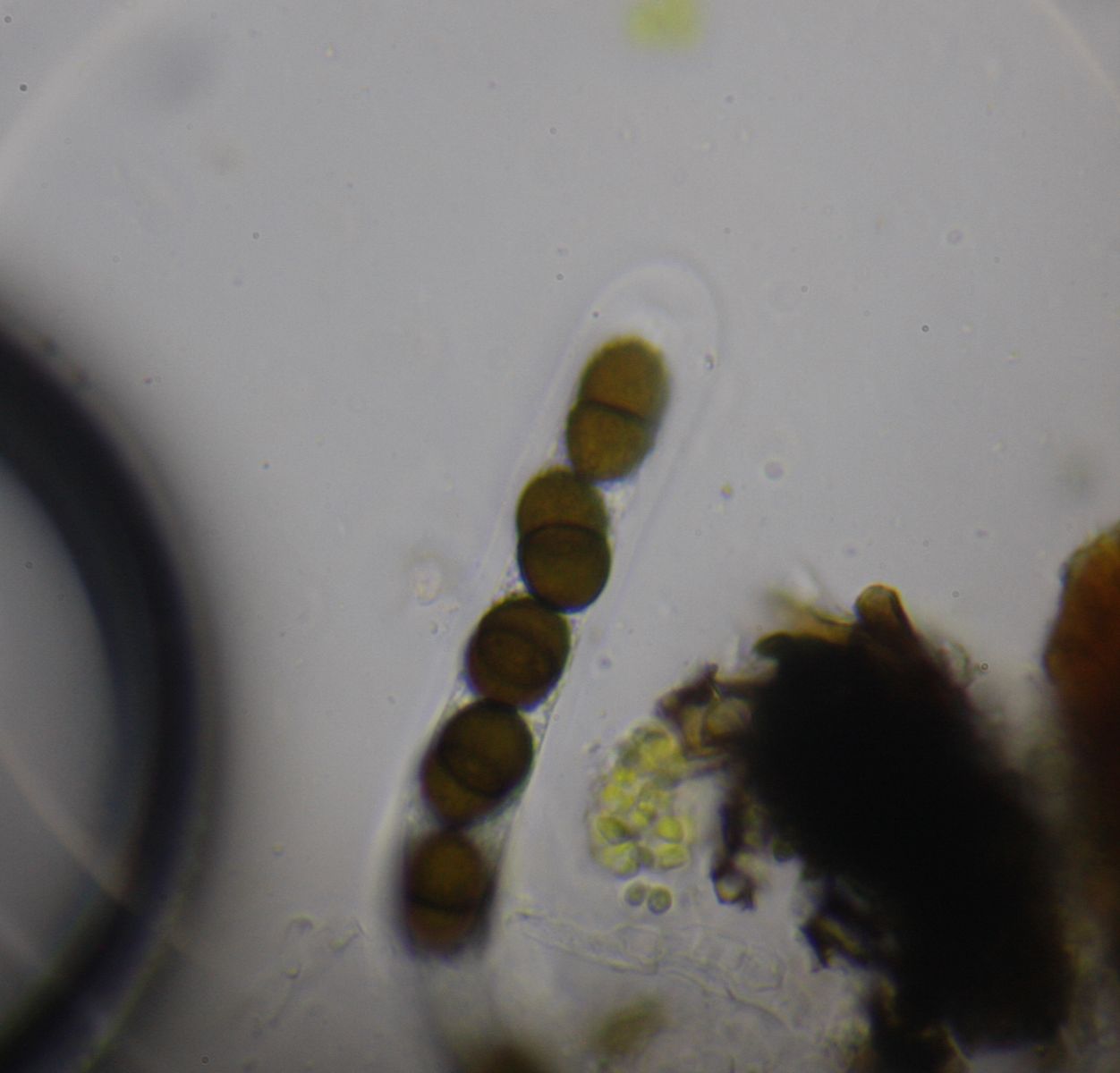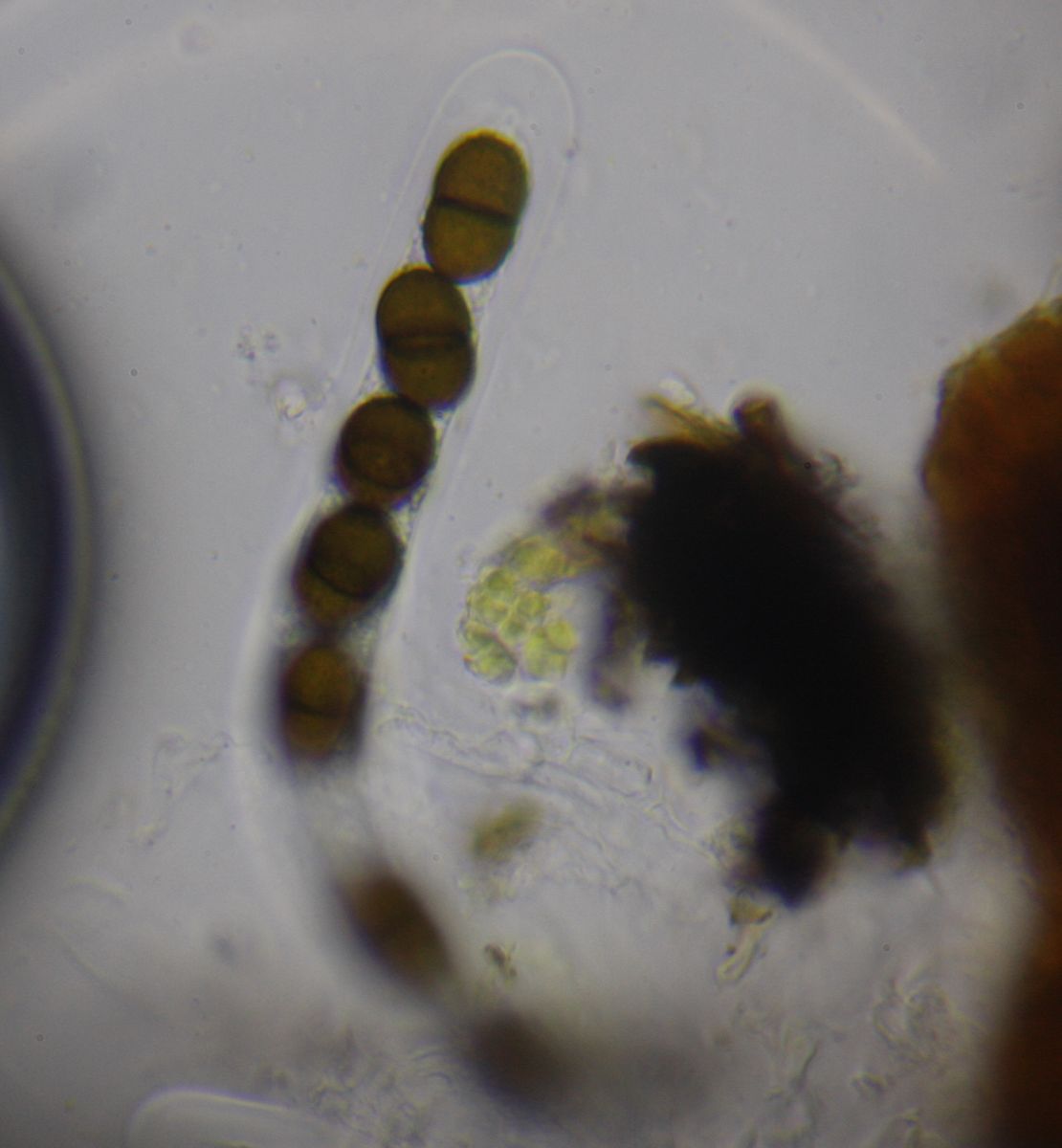 Pseudothecien im Substrat eingesenkt, recht groß, mit dicker Pseudotheciewand, Asci 8-sporig, Sporen dunkelbraun 1-s, 19,2-21,5 x 9,2-11,2 µ (Lit: 19,5-23 x 10,5-12,5µ).