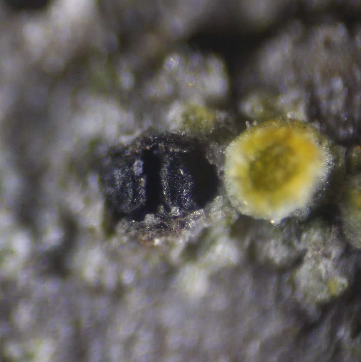 Pseudothezien in der Rinde eingesenkt, Sporen muriform, erst 3 später 5-Quersepten,im Reifen Zustand meist mehere Quersepten je Zelle, 21-25 x 10-12 µ (in der Literatur: 20.5-30,5 x 10-15 µ),Asci 8-sporig uniseriat