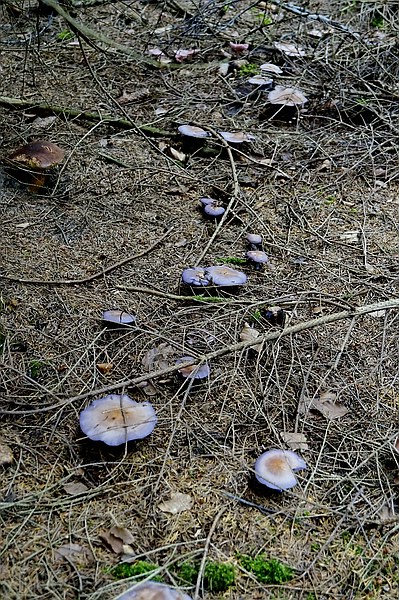 Violette Rötelritterlinge und daneben weiter hinten, könnte es sich da um lilafarbene Rötelritterlinge (Lepista sordida var. lilacea) handeln? Sie sind deutlich zarter gewachsen und die Farbe ist blasser.