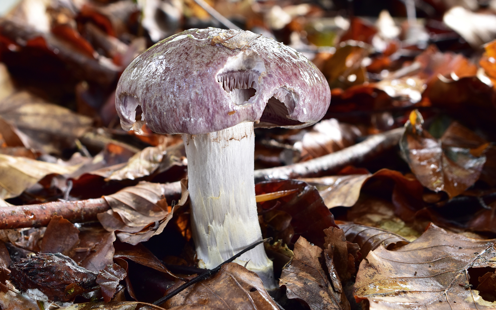 - Lamellen relativ hell mit violettem Schimmer, am Stiel ausgebuchtet, Schneiden unregelmäßig