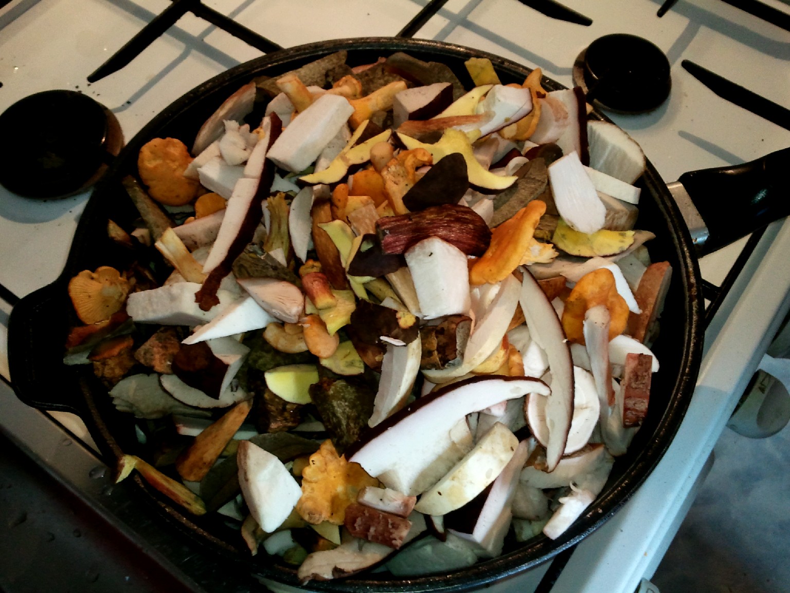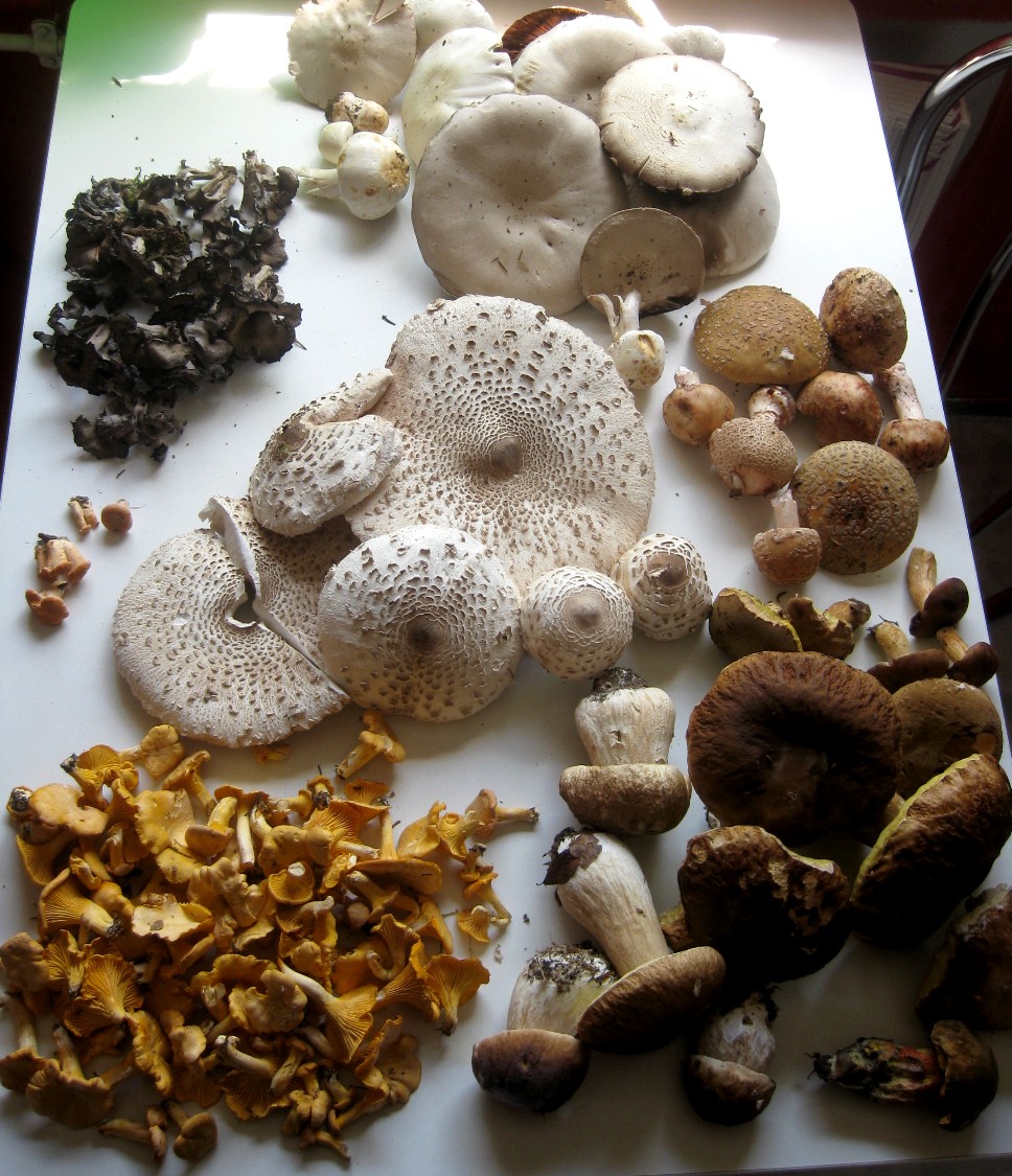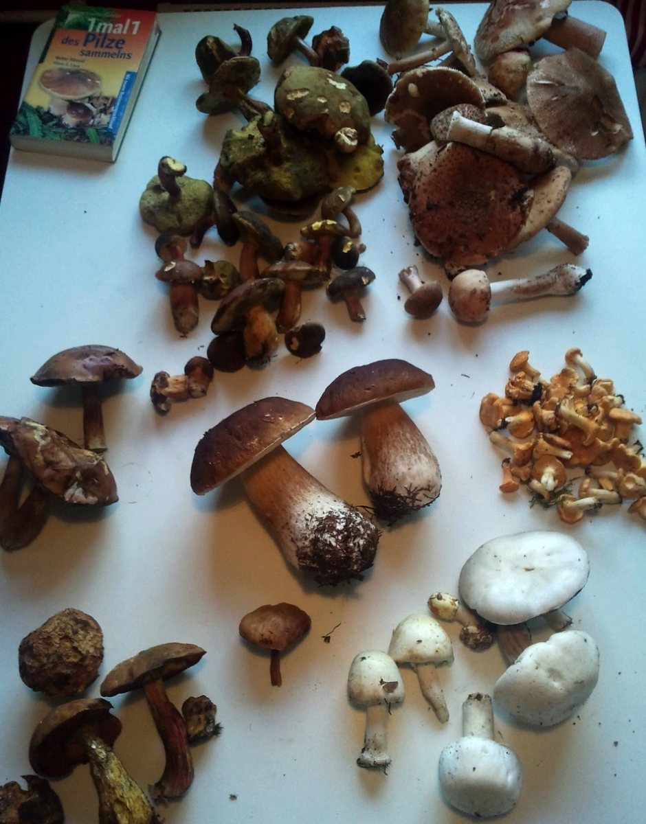 Und heute wieder: Pfifferlinge (meine Favoriten), Steinpilze, Perlpilze und Austernseitlinge(!). Hatte leider weniger Zeit, da wurde es am Ende nicht so viel...