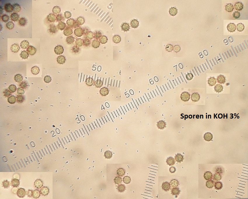 Sporenpulver: dunkelbraun; Sporen 3-4 µm, kugelig, mit großen, zylindrischen Warzen