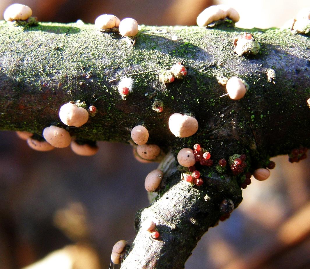 An diversem Laubholz, dicken Stämmen bis dünnen Zweigen. Erkennbar durch die markante Nebenfruchtform: Die dicken, rosa Bollen. Die kleinen, roten Punkte sind die Hauptfruchtform.