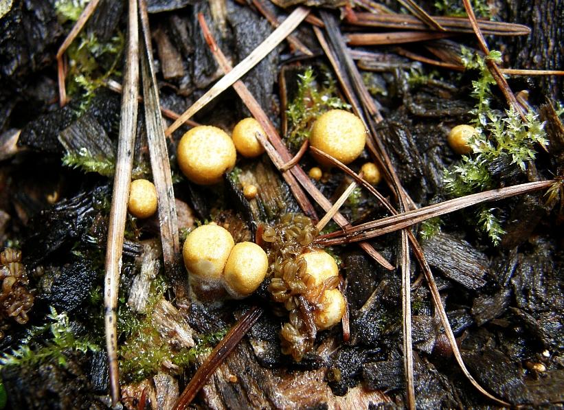 Substrat ist Nadelholz, Kiefer oder Lärche, liegender Ast teils im Laub vergraben