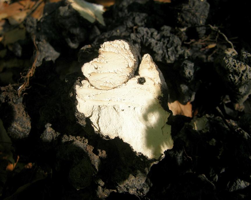 Die schwarze Kruste ist sehr hart, runzlig und dünn, dabei glatt (also keinerlei Filzigkeit oder Perithecien erkennbar).