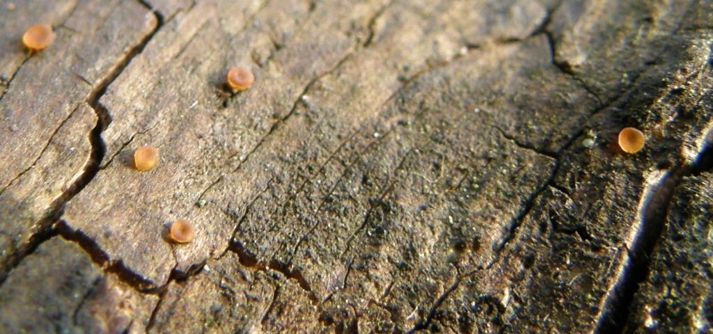 Ein Winzling an einem etwa Beindicken, stehenden aber recht durchmorschten xyz - Stamm (Pappel?). Wenn es nicht zwei Winzlinge sind. Bitte stellt euch die Farben etwas kräftiger vor, also gerade das unförmige Stadium sollte schon richtig rot sein. Diese roten, irgendwie an Gallerttränen erinnernden Bollos jedenfalls fanden sich nur wenige cm entfernt von den anderen, etwas heller orangeroten, knapp millimetergroßen Orbilia - ähnlichen Gestalten.