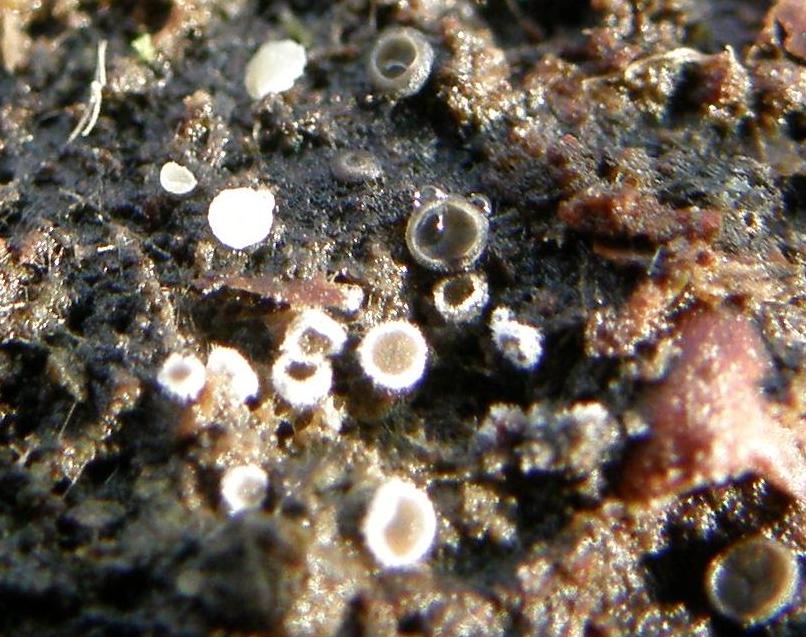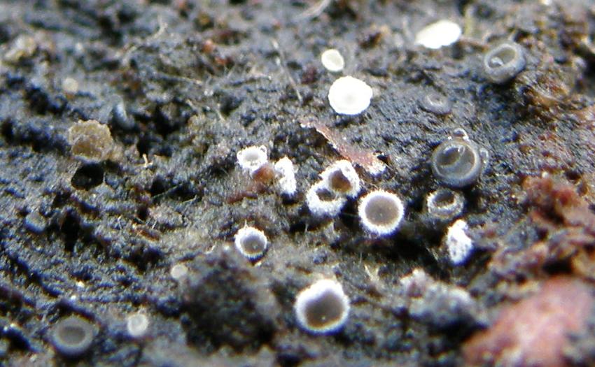 Irgendwo im Wald fand sich ein riesiger Eichenstumpf. Sowas weckt natürlich das Interesse. Also die Laubschicht darauf mal vorsichtig zur Seite geschoben und mal draufgeguckt. Unter Unmengen teils "riesiger", alter Mollisias, verfallener Bisporellas, Käfern von unten und von oben, fand sich auch etwas Becherförmiges mit weißen Haaren und grauer Innenschicht. Irgendwo hatte ich mal von Lachnella alboviolascens gehört. Aber sollte die nicht an dünnerem Substrat wachsen? Ist L. alboviolascens so ohne Mikros überhaupt einigermaßen sicher anzusprechen?