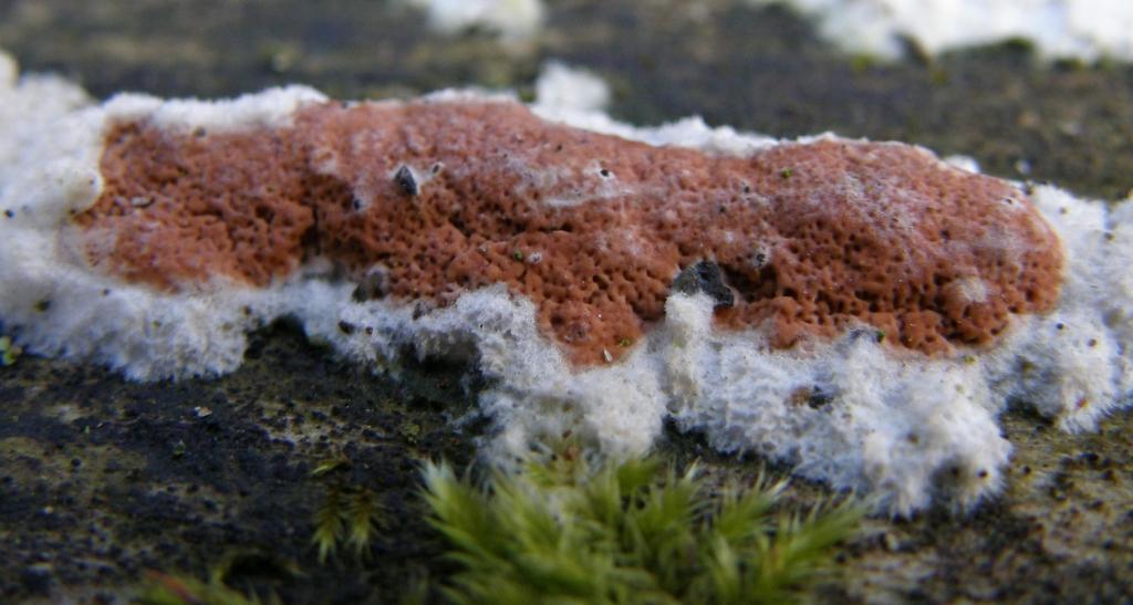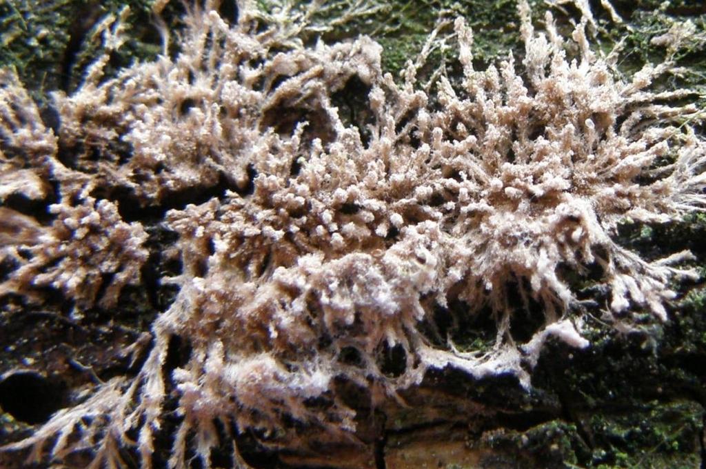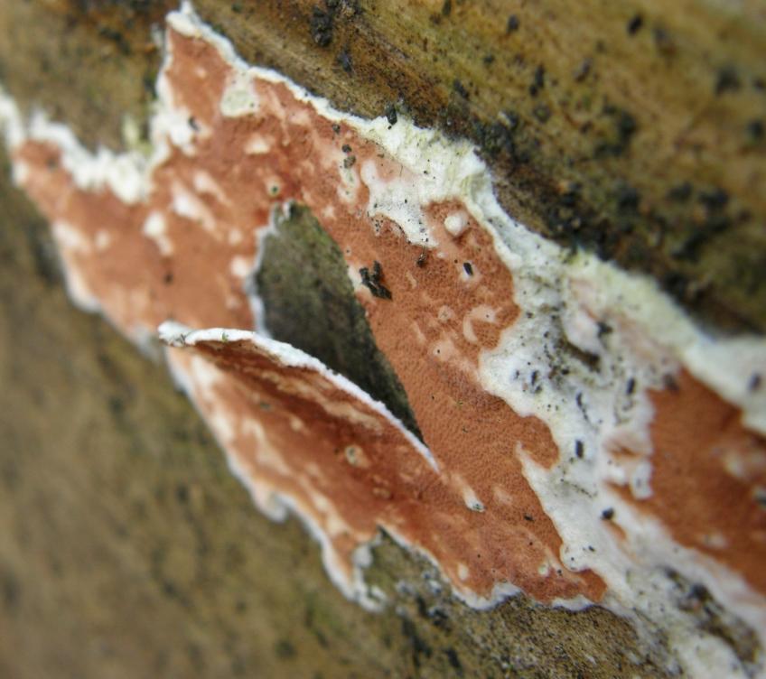 Am selben Stamm wie das Dacrymyces-Nectria-Orbilia-Ding saß auch die weiße Spinne. Bekannt eigentlich den bergsteigern unter uns als ein Eisfeld in der Eiger Nordwand. Es sitzt knapp über einem weißlichen Schichtpilz, der nicht näher untersucht wurde, aber möglicherweise auf ablösender Rindenschichtpilz (Cylindrobasidium evolvens / laeve) hört. Aber um den geht es ja auch nicht, sondern um das Gefussel darüber, das ich irgendwo schon mal gesehen zu haben glaube. Aber ich komme nicht drauf...