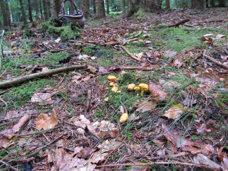 Und noch mal 250 Meter weiter Cantharellus Friesii. Aber zumindest bei den von mir beobachteten Funden von Cibarius, Amethysteus und Pallens sind - im makroskopischen Bereich - die Übergänge recht fließend.