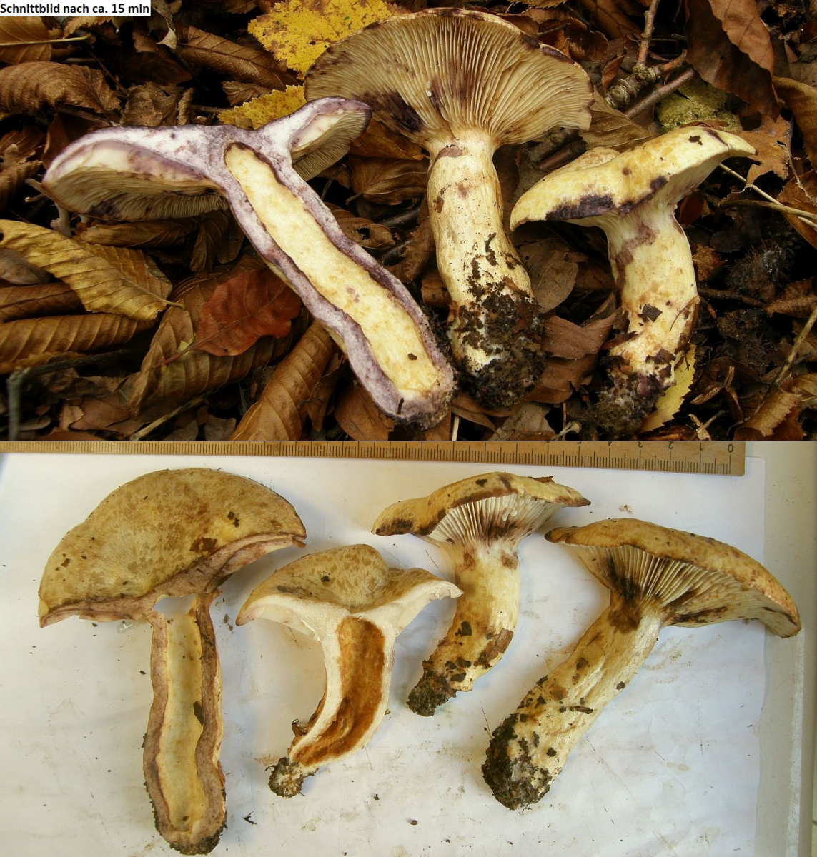 Einer der Violettmilchlinge ist das sicher nicht, denn die Verfärbung ist da schon (nach 20 Minuten umso mehr) sehr viel deutlicher. Das sieht dann aus wie hier bei Lactarius flavidus: