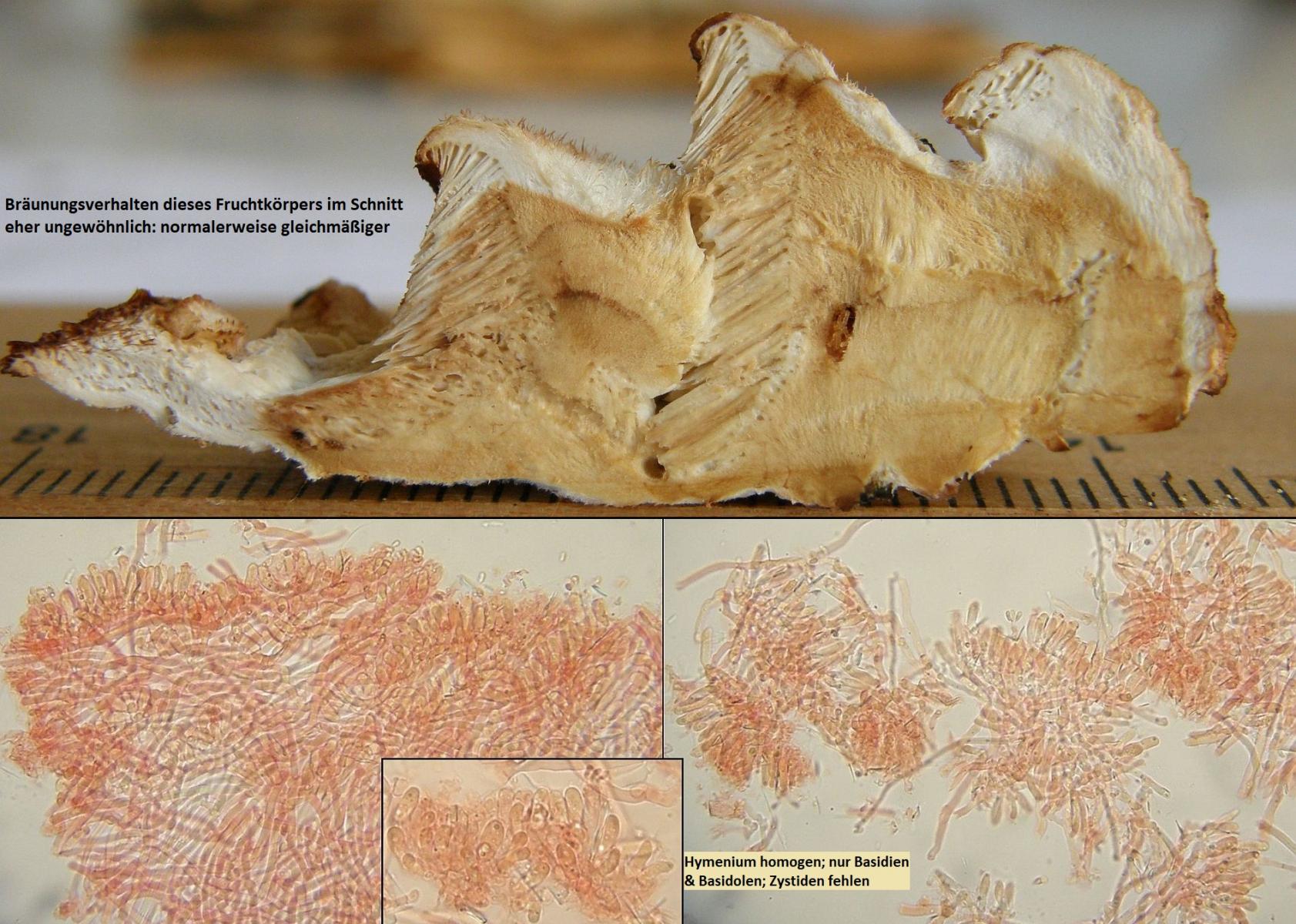 Bei Phellinus geht es eigentlich ganz gut, weil man meistens den Unterschied recht gut sieht - also die Röhrentrama, die fast nur aus dickwandigen und unseptierten Hyphen besteht, und dann stärker hyaline, regelmäßig septierte, meistens dünnwandige Hyphen im Bereich des Hymeniums.
