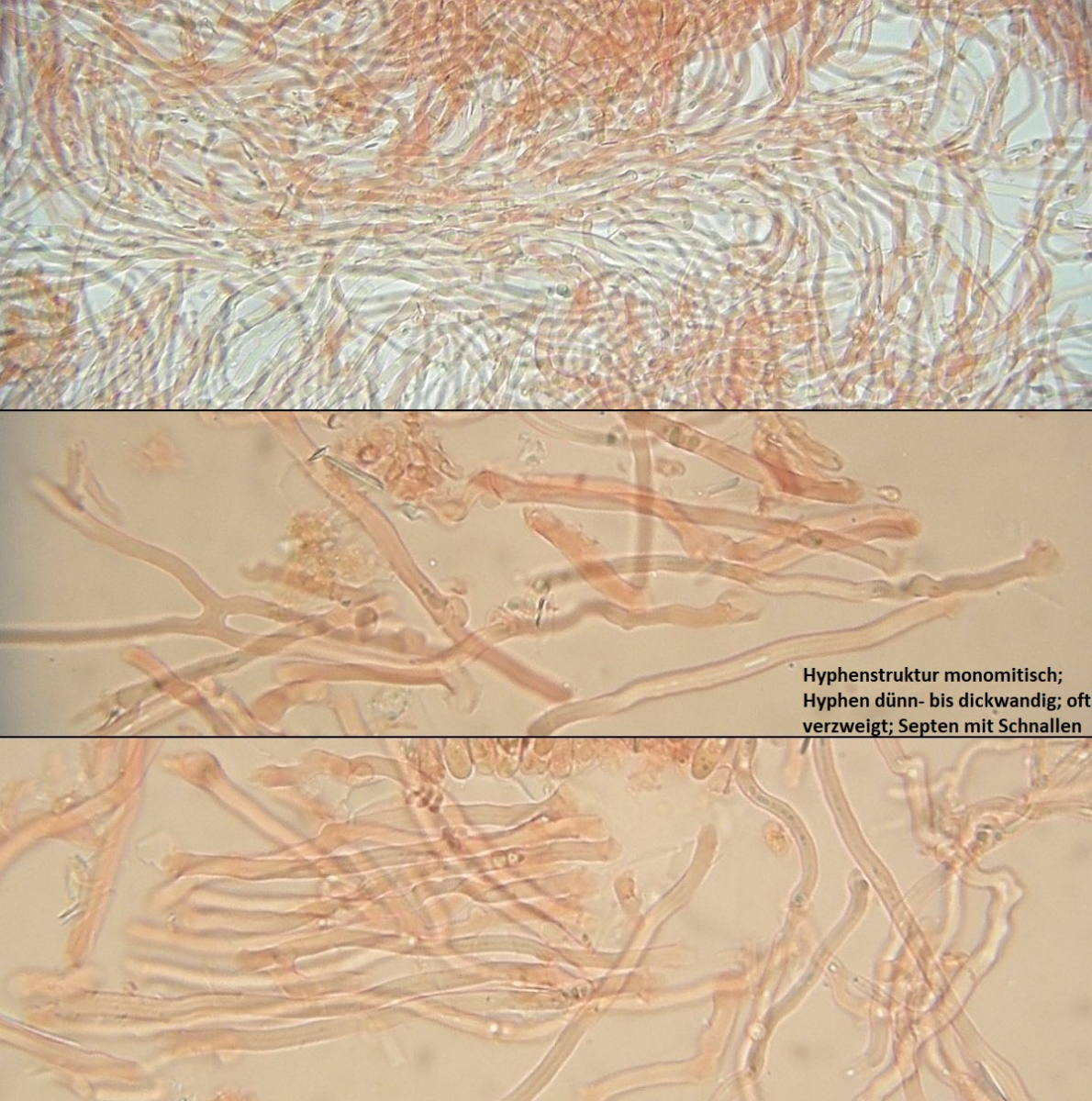Skeletthyphen sind vor allem unseptiert, daß ist der wesentliche Punkt. In der Tat ist das manchmal schwer zu erkennen, bei Arten, die sklerifizierte generative Hyphen bilden. Also sickwandige Hyphen, die manchmal recht lang ohne Septen durchlaufen - aber irgendwo findet man die Septen dann doch.