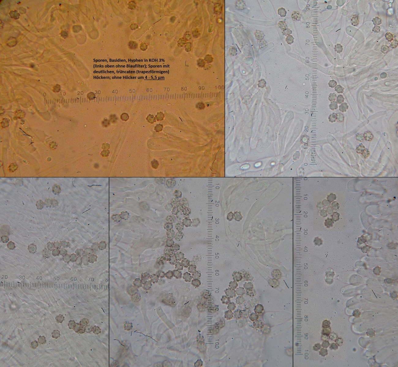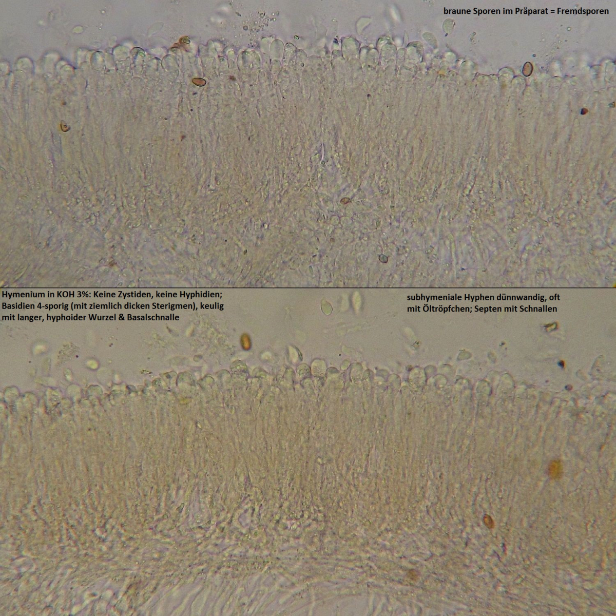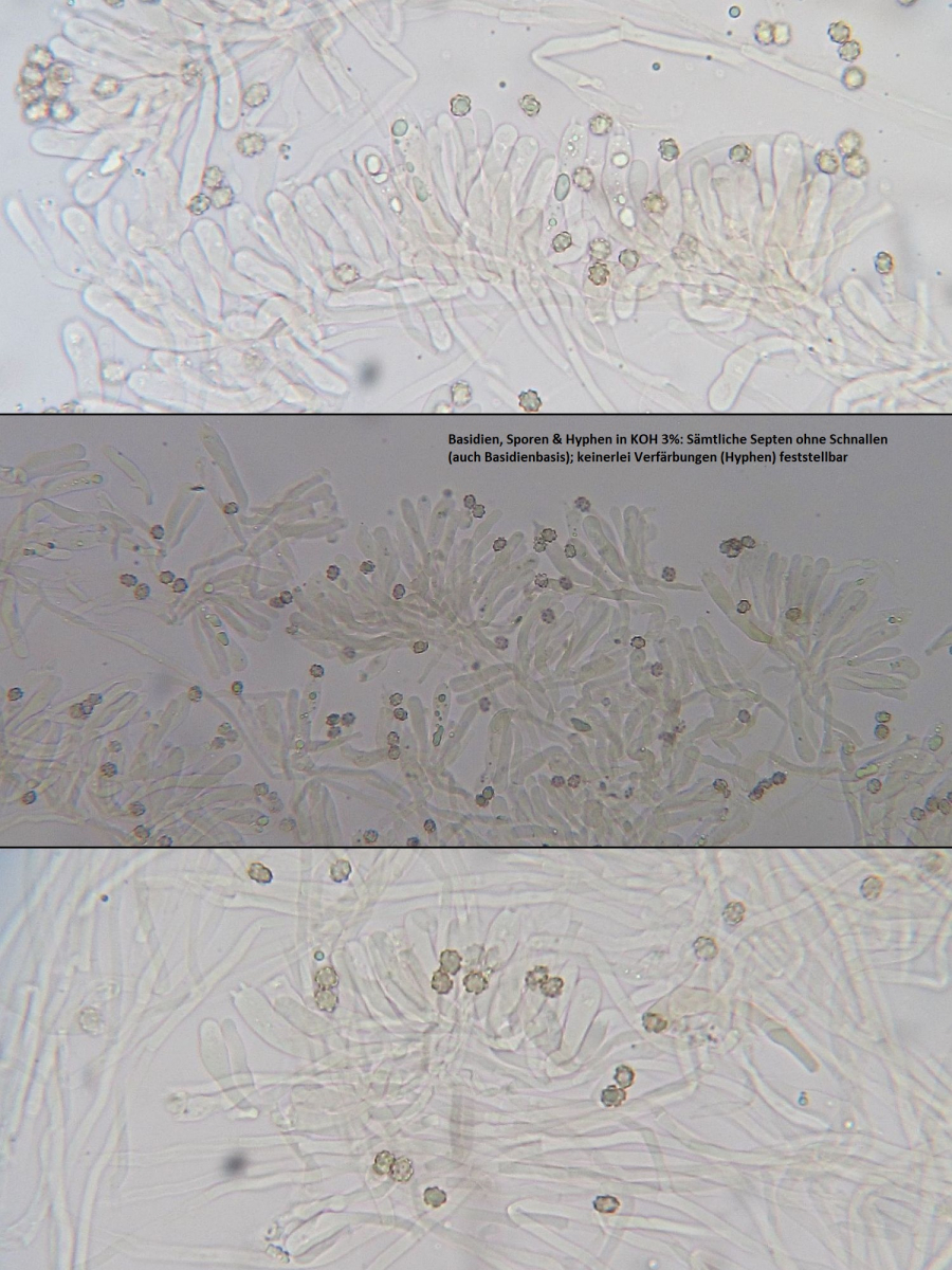 Weil in mehreren Präparaten keine einzige Spore zu finden ist. Theoretisch gibt es noch zwei Arten (wenn denn beide tatsächlich eigene Arten sind), die sich wohl nur durch kleinere Sporen von Corticium roseum unterscheiden. Bis darauf sieht der so aus, wie andere Kollektionen von Corticium roseum, also würde ich da schon zu der häufigsten Art tendieren, aber eben ein cf stehen lassen.