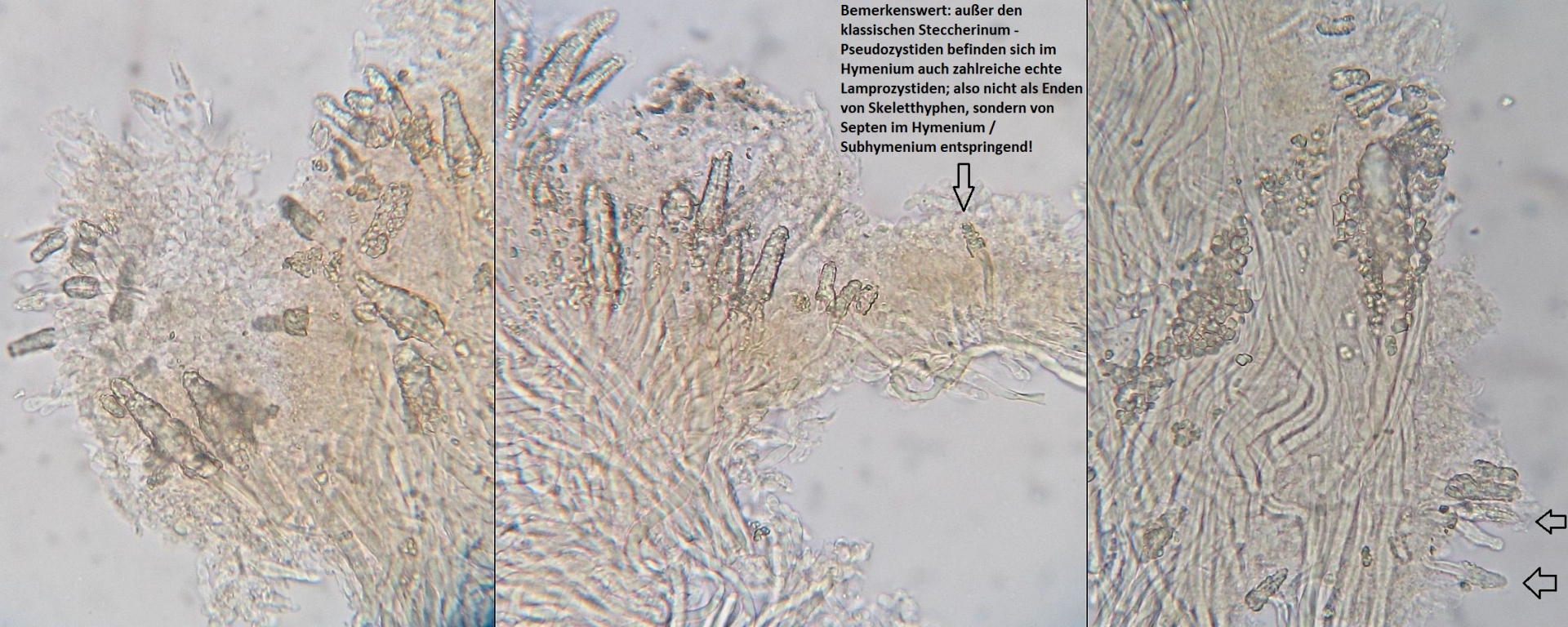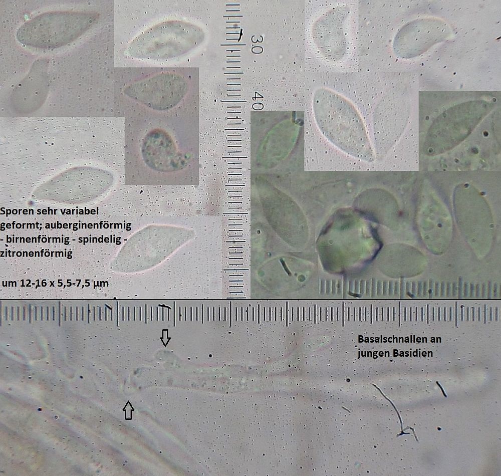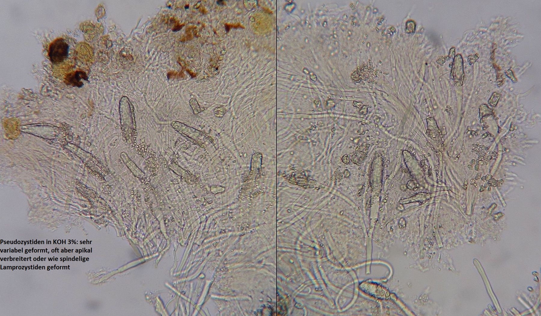 Weil in mehreren Präparaten keine einzige Spore zu finden ist. Theoretisch gibt es noch zwei Arten (wenn denn beide tatsächlich eigene Arten sind), die sich wohl nur durch kleinere Sporen von Corticium roseum unterscheiden. Bis darauf sieht der so aus, wie andere Kollektionen von Corticium roseum, also würde ich da schon zu der häufigsten Art tendieren, aber eben ein cf stehen lassen.