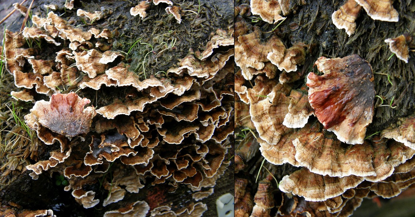 Nr. 12: Solche blassen Fruchtkörper an Kirschlorbeer hatte ich auch schon, war aber wohl nur wieder eine komische Ausprägung von Trametes versicolor. Die sind ja farblich arg variabel.
