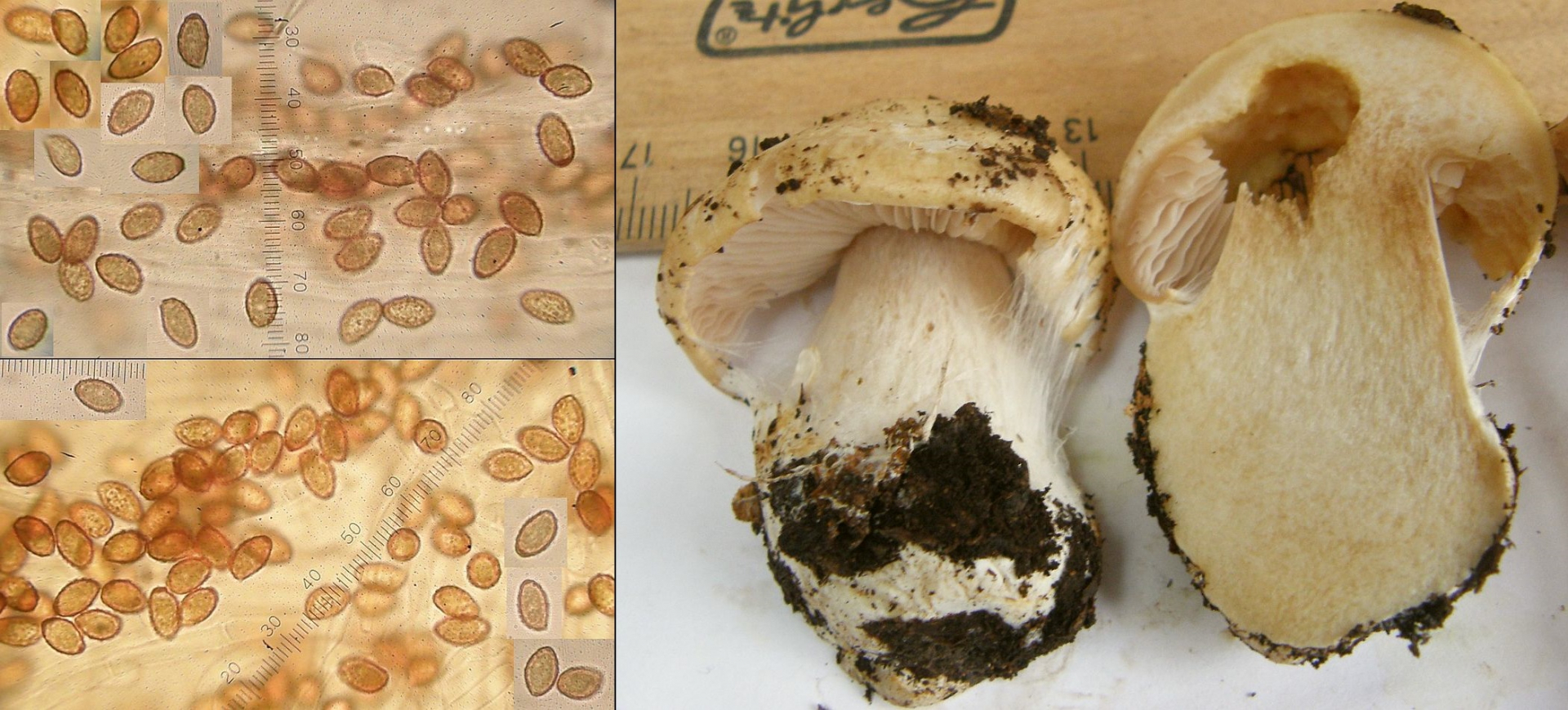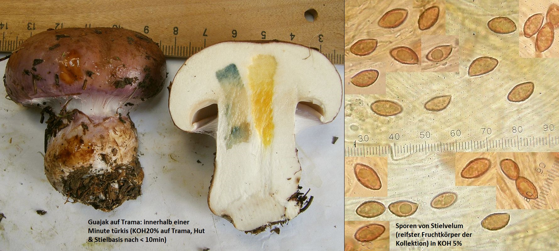 Leider: Im kaum auffindbaren Velum am Stiel waren Sporen noch weniger auffindbar. Ein Hut wurde noch zum Absporen gebracht, aber das Ergebnis muss wohl ignoriert werden, das sieht nach einem typischen Notreifeabwurf aus, dann wären sowohl Sporenmaße als auch Ornamentierung nahezu ohne Aussagekraft.