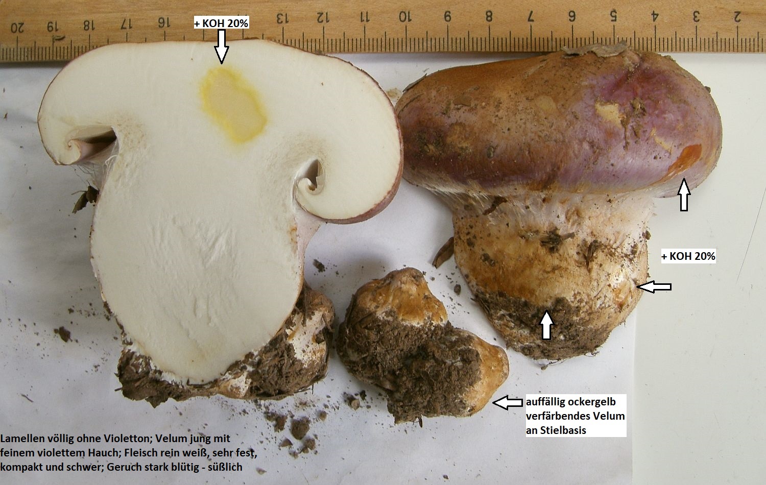 null Violettöne in jungen Lamellen, an Stielbasis und in Trama, Velum teils aber mit ganz blassem Violettschimmer. Vleum (sollte Velum heißen, aber den Tippfehler lasse ich stehen. "Vleum" klingt toll, ein wenig nach "Flaum") an Stielbasis gar nicht violett aber auffallend kräftig ocker verfärbend;