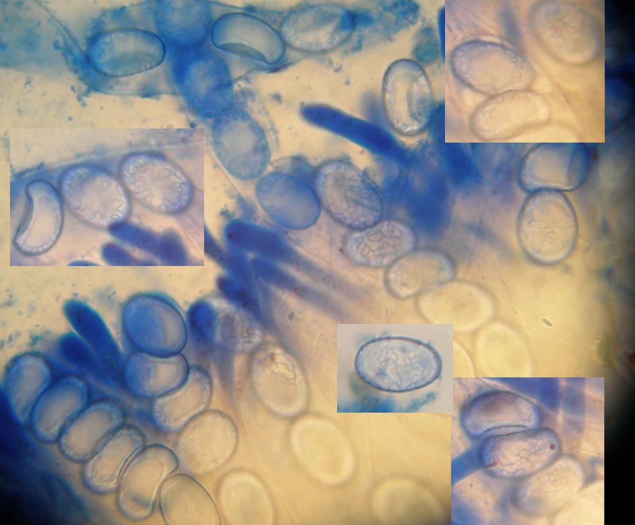6.: Passt hier gut in den Zusammenhang, denn da hast du Fremdsporen im Präparat (die echten Sporen von Phlebia tremellosa sehen ganz anders aus). Damit muss man auch achten, Fremdsporen sind hinterhältig, aber eben auch omnipräsent. Darum suche ich bei jedem Pilz auch nach Sporen, die noch an den Basidien ansitzen, nehme zum vermessen dann eben frei schwimmende Sporen des gleichen Typs und kann weitestgehend alle umherschwimmenden fremdsporen ignorieren.
