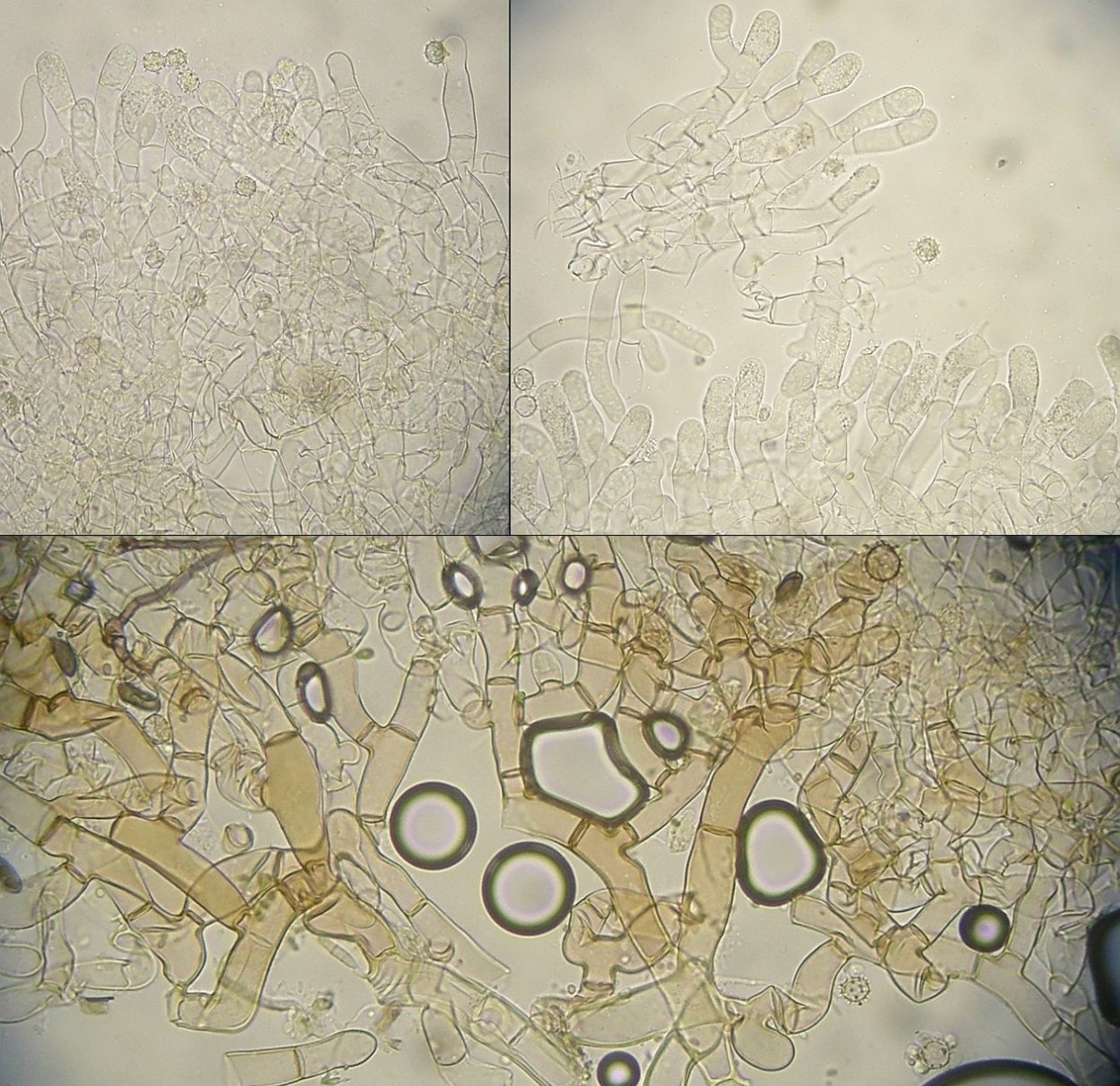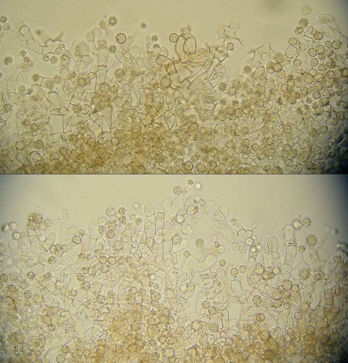 mikroskopische Eigenschaften: Hyphenstruktur monomitisch, Septen mit Schnallen; Hyphen im Subhymenium phlebia-typisch dicht verklebt und etwas gelifiziert; in der Stacheltrama +/- parallel, teilweise mit Öltröpfchen und stellenweise schwach bis sher stark inkrustiert; Hyphen im Subikulum lockerer verknüpft; Basidien viersporig (seltener 2sporig); Im Hymneium, Subhymenium und Stacheltrama mit (meistens) zahlreichen und deutlichen, inkrustierten Lamprozystiden (zylindrisch bis zuspitzend); Sporen hyalin, inamyloid, glatt, elliptisch bis subzylindrisch, manchmal innerhalb einer Kollektion recht variabel, meist aber um 4-6 x 2,5-3 µm