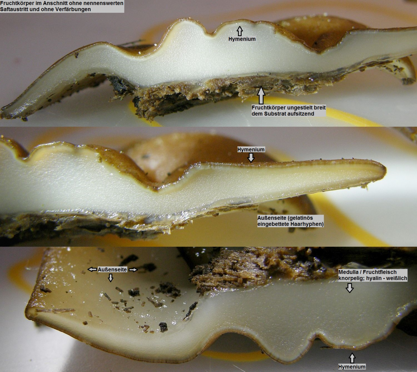 Arten wie Pachyella punctispora gehören schon in eine andere Sektion, hier sind die Haarhyphen der Außenseite nicht als so auffällige, in Gel eingebettete Matrix ausgebildet.