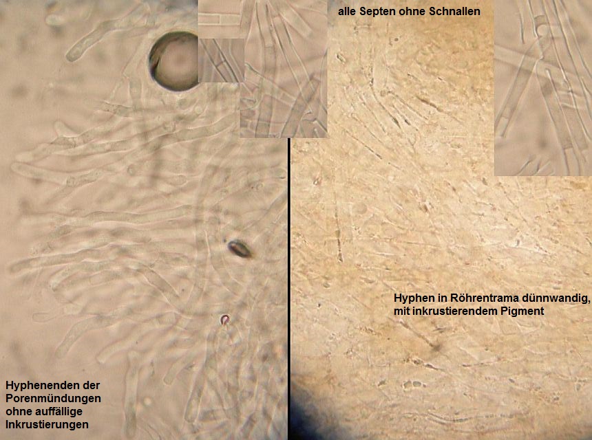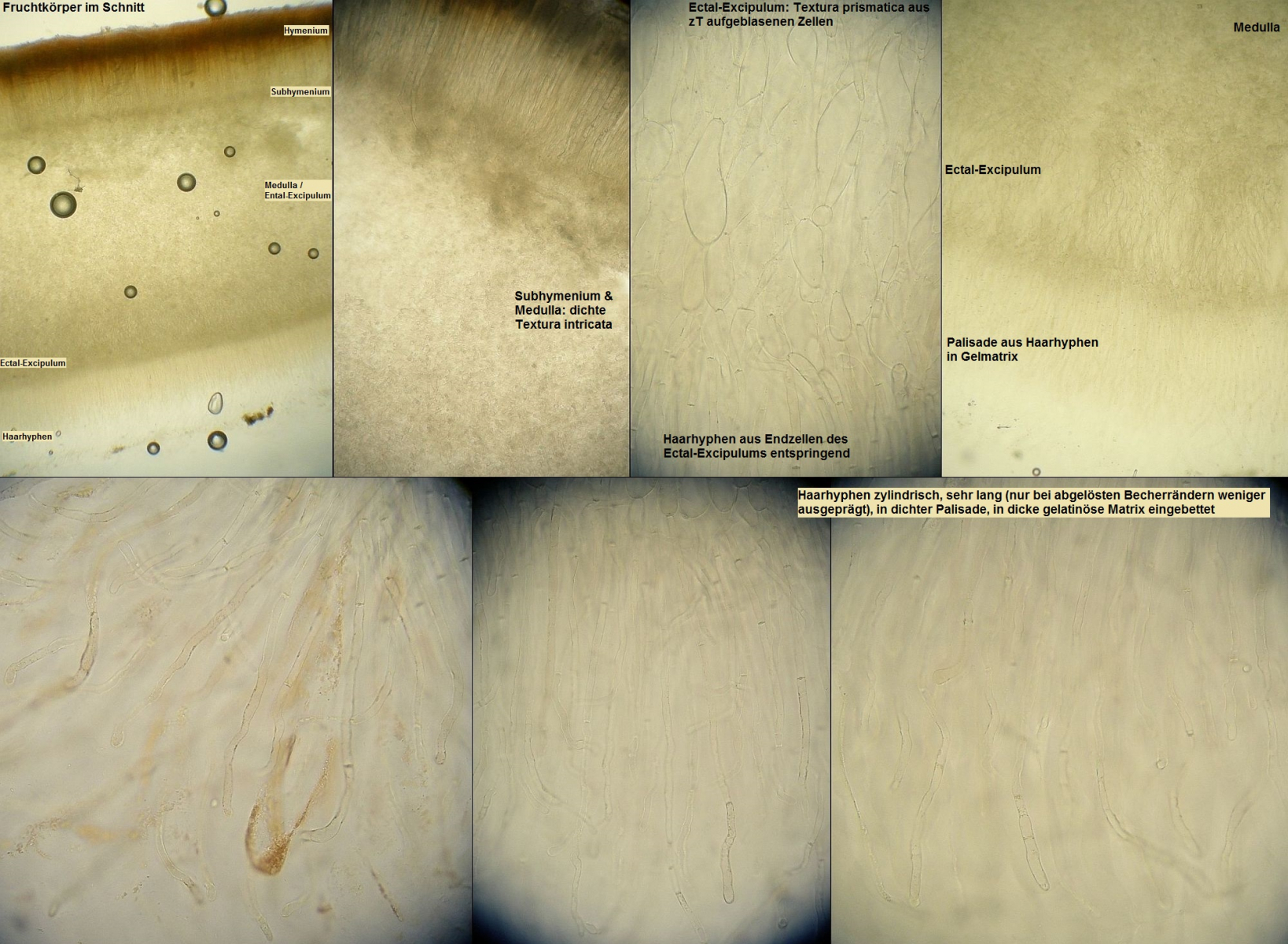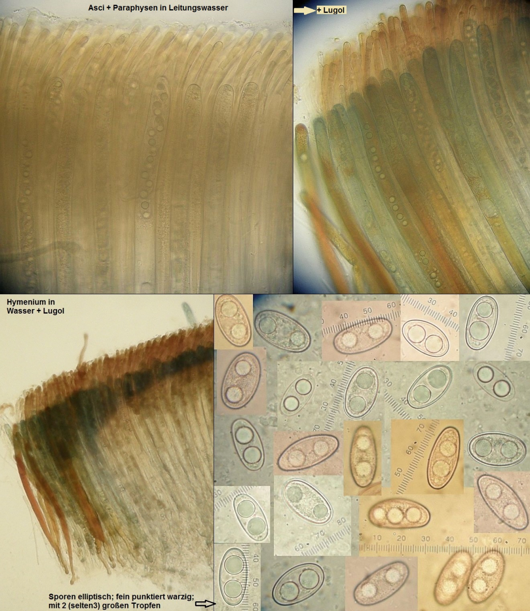mikroskopische Eigenschaften: siehe unten, Mikrodokumentation. Asci stark amyloid, oft auf mehr als der Hälfte blau färbend; Paraphysen apikal leicht keulig, regelmäßig, lange Zeit die Asci überragend; Sporen elliptisch, reif fein punktiert (Anfärben hilft, manchmal klappt Kongorot noch besser als Baumwollblau) und normalerweise etwas dickwandig; etwa 19-28 x 11-14 µm; Haarhyphen der Außenseiten vor allem in Bereichen, wo der Becher dem Substrat aufliegt kräftig ausgebildet, zylindrisch, in einer dicken, gelatinösen Matrix eingebettet und stellenweise mit feinem Pigment inkrustiert.