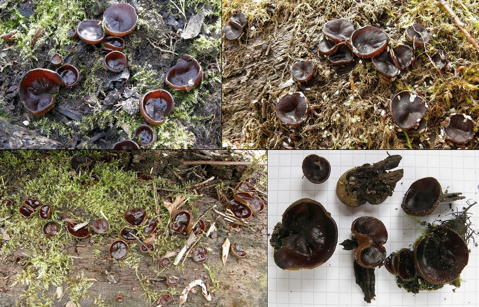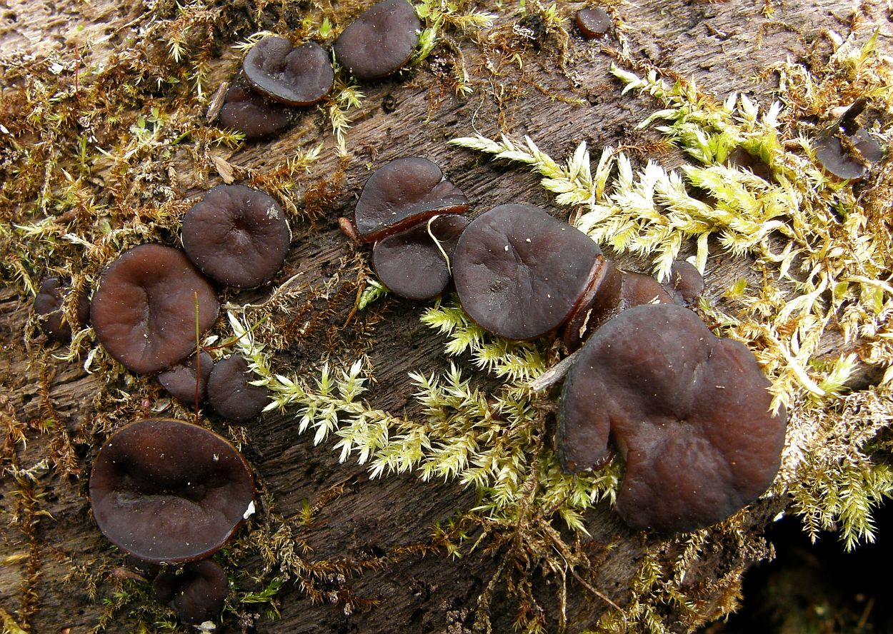 makroskopische Eigenschaften: Ausgewachsene Fruchtkörper ungestielt, mit breiter Basis festgewachsen, bis um 50mm im Durchmesser; normalerweise auf ganzer Breiteflach dem Substrat aufliegend mit unregelmäßig (wellig-faltiger) konvexer Oberfläche, seltener (und dann meist unreif) mit aufgebogenen und vom Substrat abstehenden Becherrändern; die Hymenialschicht ist glatt, etwas schmierig und erscheint bei manchen Kollektionen irgendwie hygrophan; typischerweise dunkel violettbraun gefärbt, bisweilen aber auch heller und ohne Violettöne; die Becheraußenseite / Unterseite ist heller, zur Basis hin weißlich und in der Haptik deutlich schmierig bis glitschig, oft mit dem Substrat und / oder ansitzenden Moosen verwachsen; Fleisch hyalin-weißlich, ohne Verfärbungen; weich-knorpelig und schmierig.