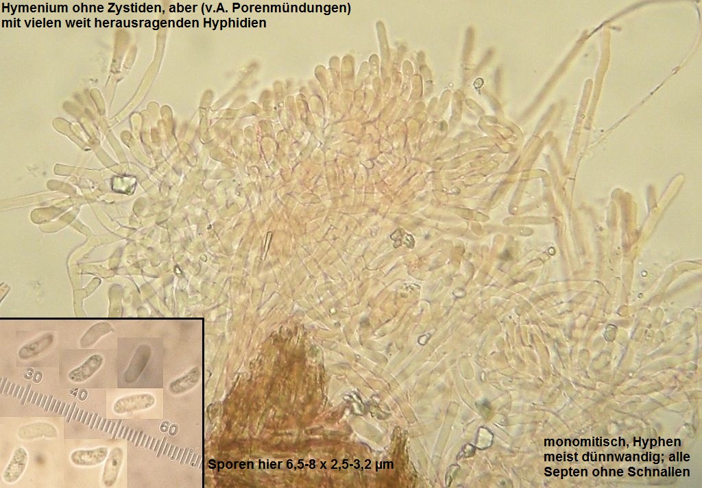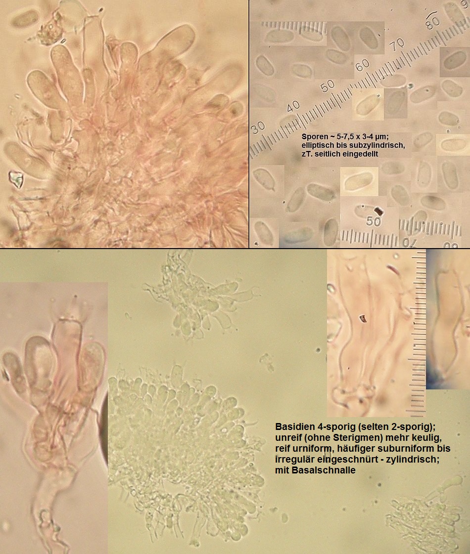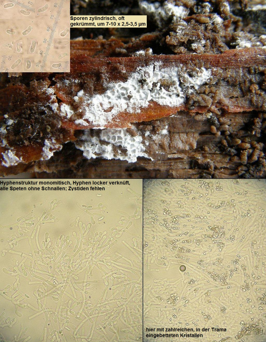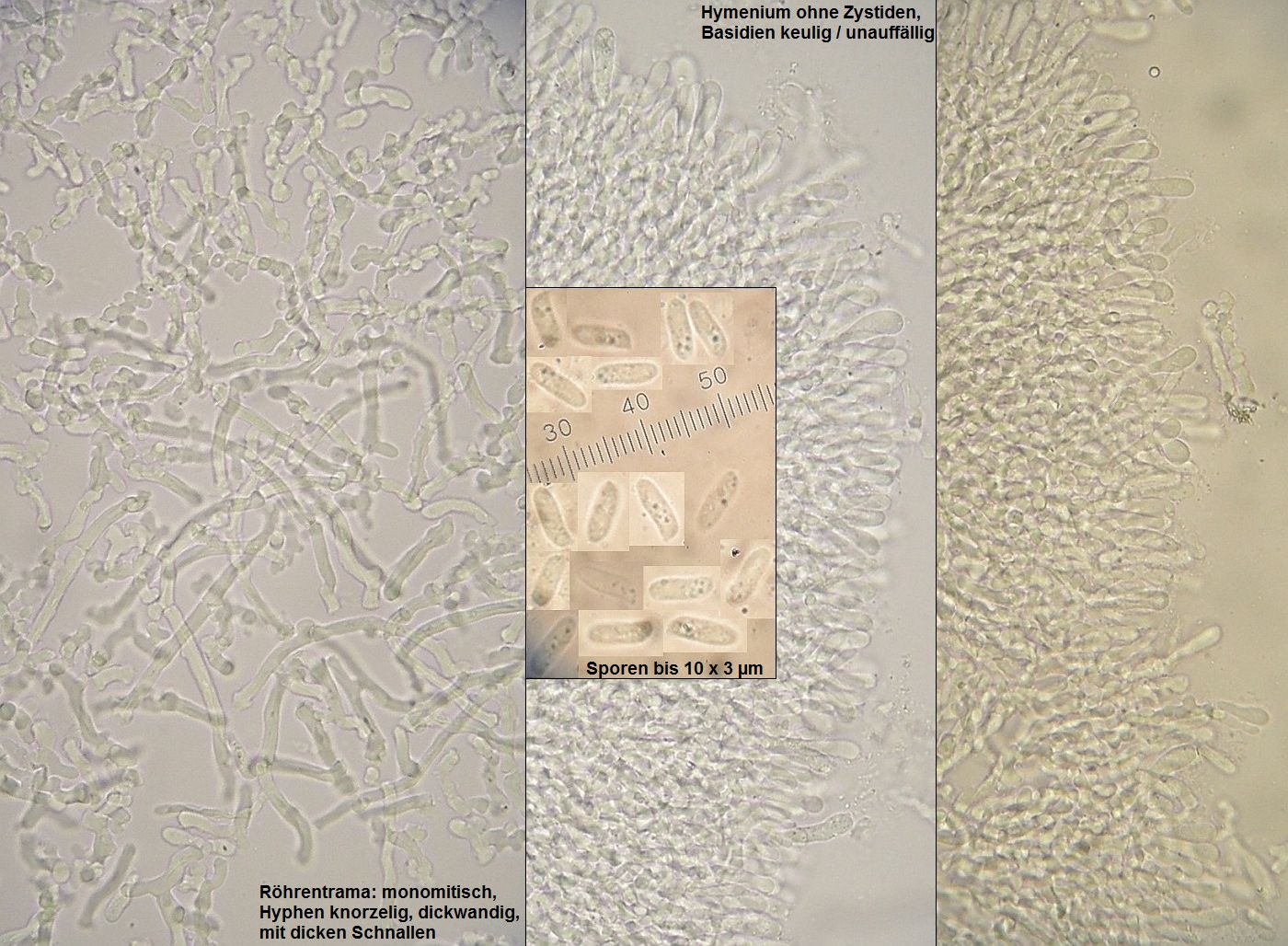 mikroskopische Eigenschaften: Hyphenstruktur monomitisch, generative Hyphen hyalin, überwiegend dünnwandig, locker verknüpft und leicht zu isolieren; alle Septen ohne Schnallen; Zystiden fehlen im Hymenium; Basidien keulig, überwiegend 4-sporig, ohne Basalschnalle; Sporen glatt, dünnwandig, inamyloid, nicht dextrinoid, zylindrisch bis allantoid; um 6.5-10 x 2,2-3,5 µm