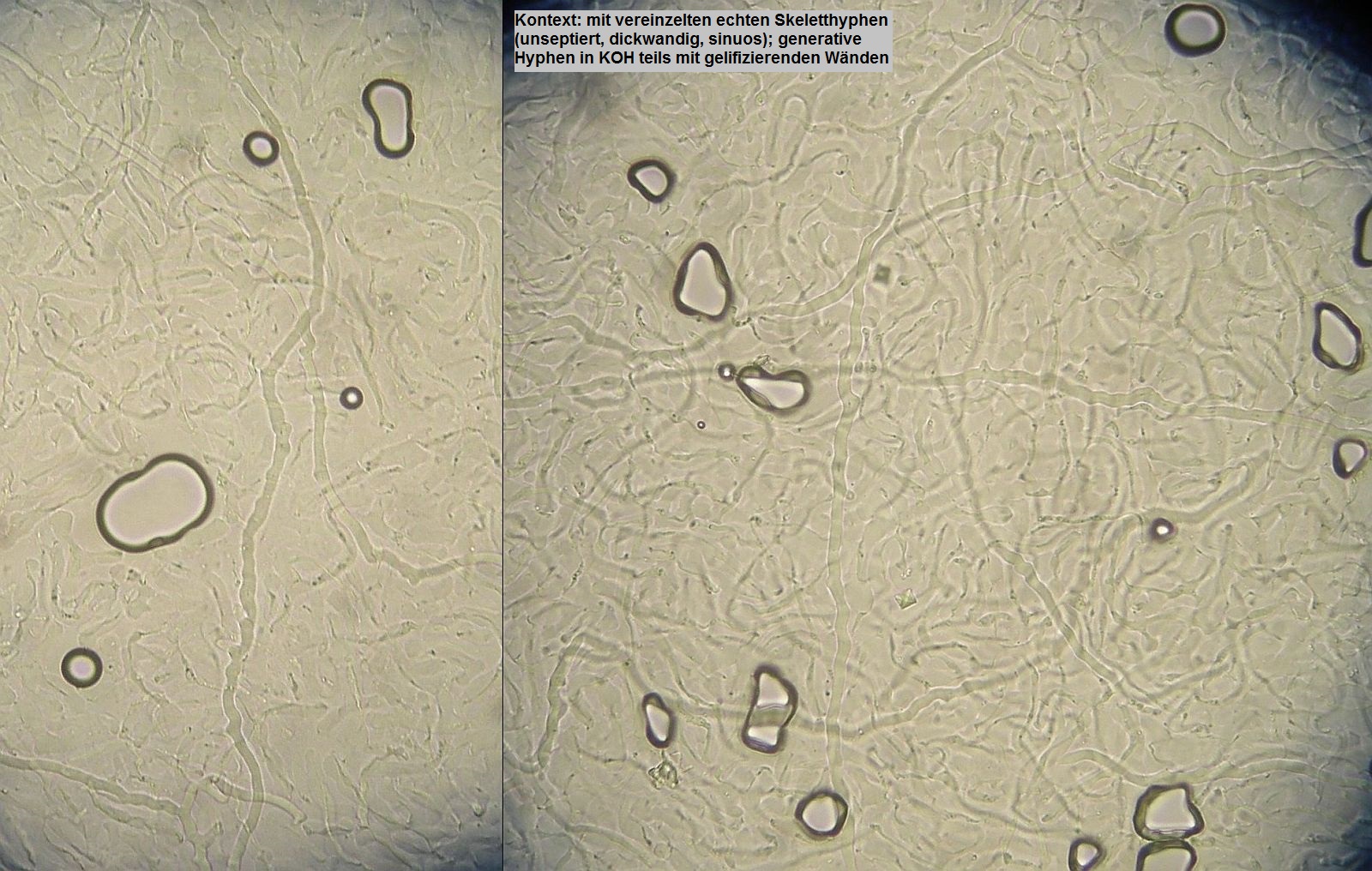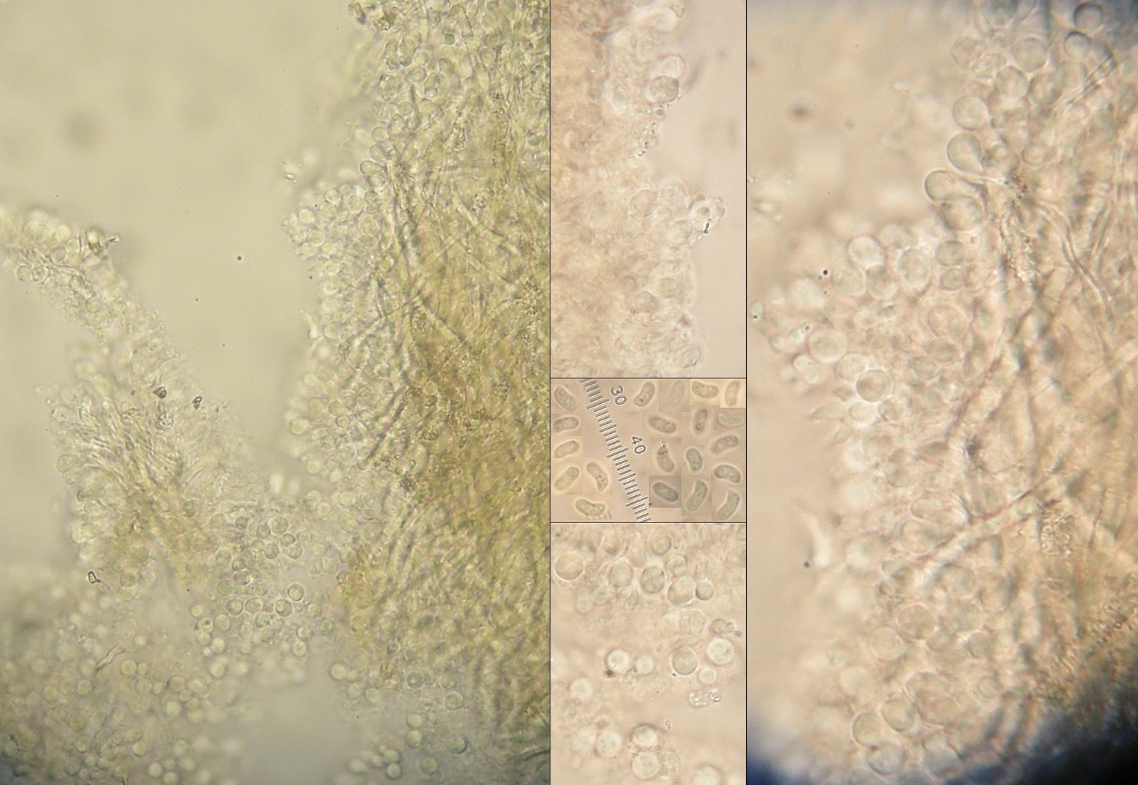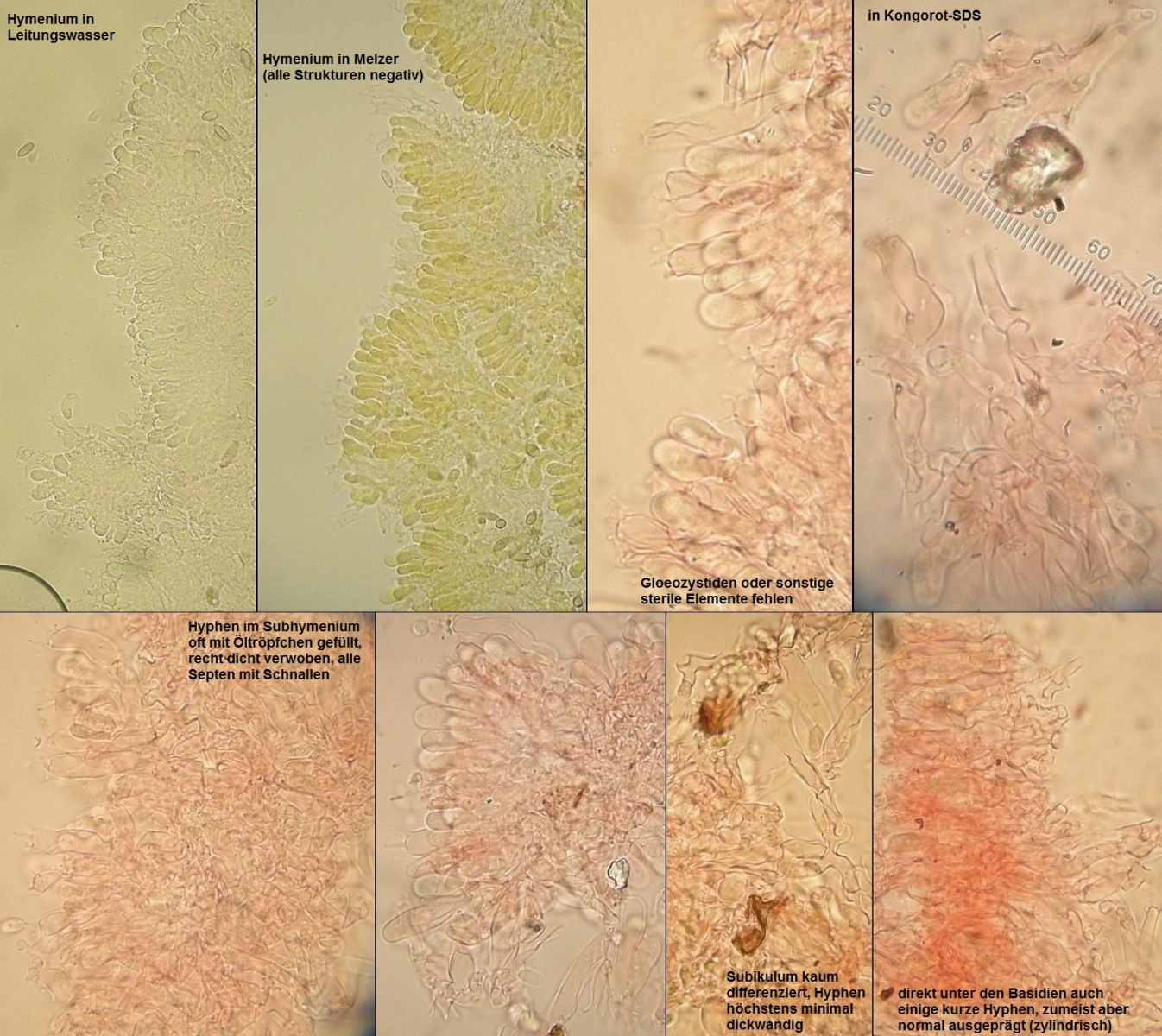 mikroskopische Eigenschaften: Hyphenstruktur monomitisch, generative Hyphen hyalin, überwiegend dünnwandig, locker verknüpft und leicht zu isolieren; alle Septen ohne Schnallen; Zystiden fehlen im Hymenium; Basidien keulig, überwiegend 4-sporig, ohne Basalschnalle; Sporen glatt, dünnwandig, inamyloid, nicht dextrinoid, zylindrisch bis allantoid; um 6.5-10 x 2,2-3,5 µm