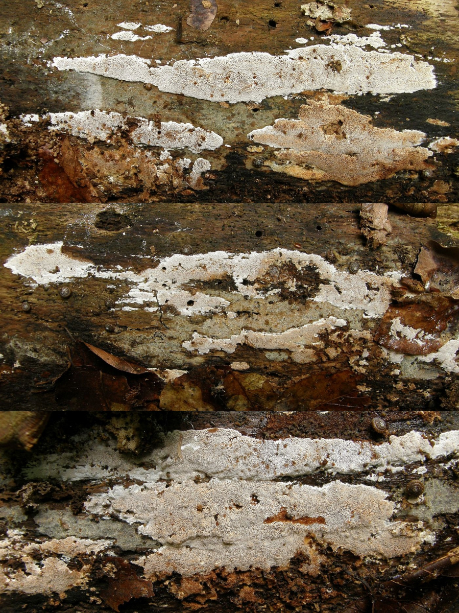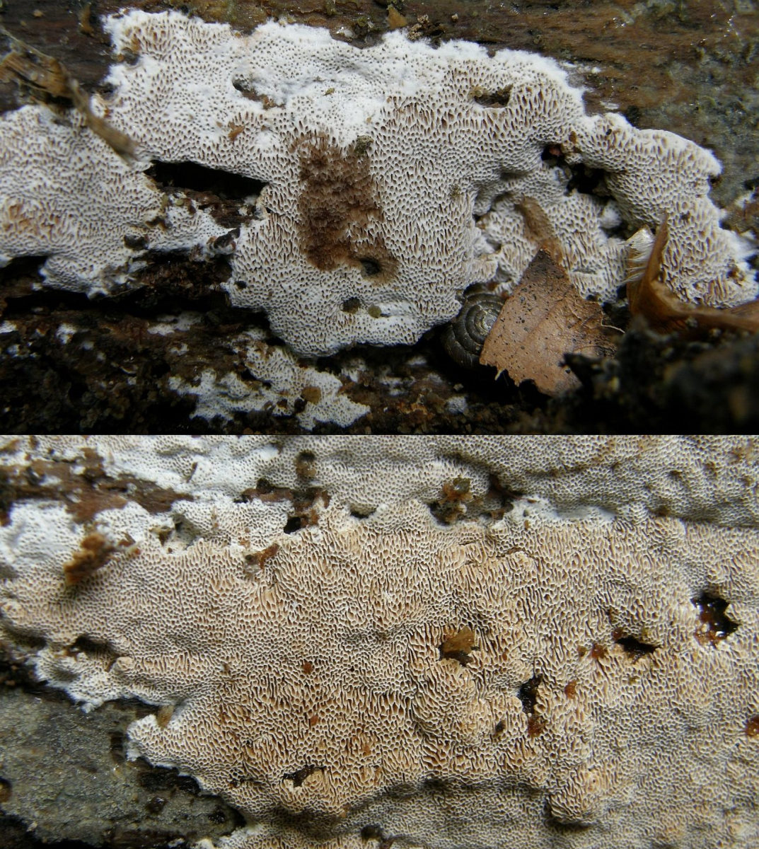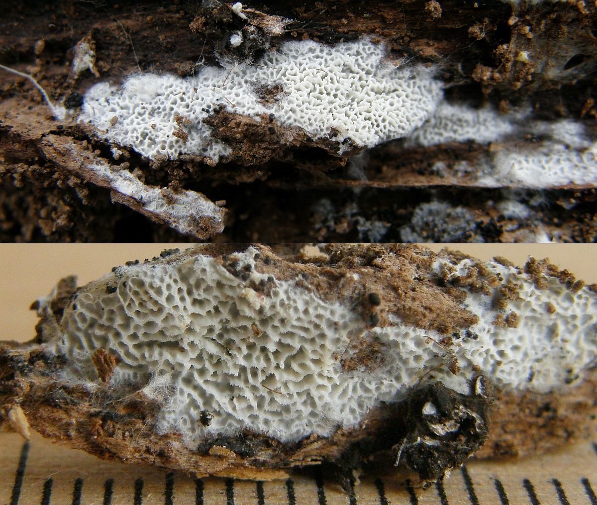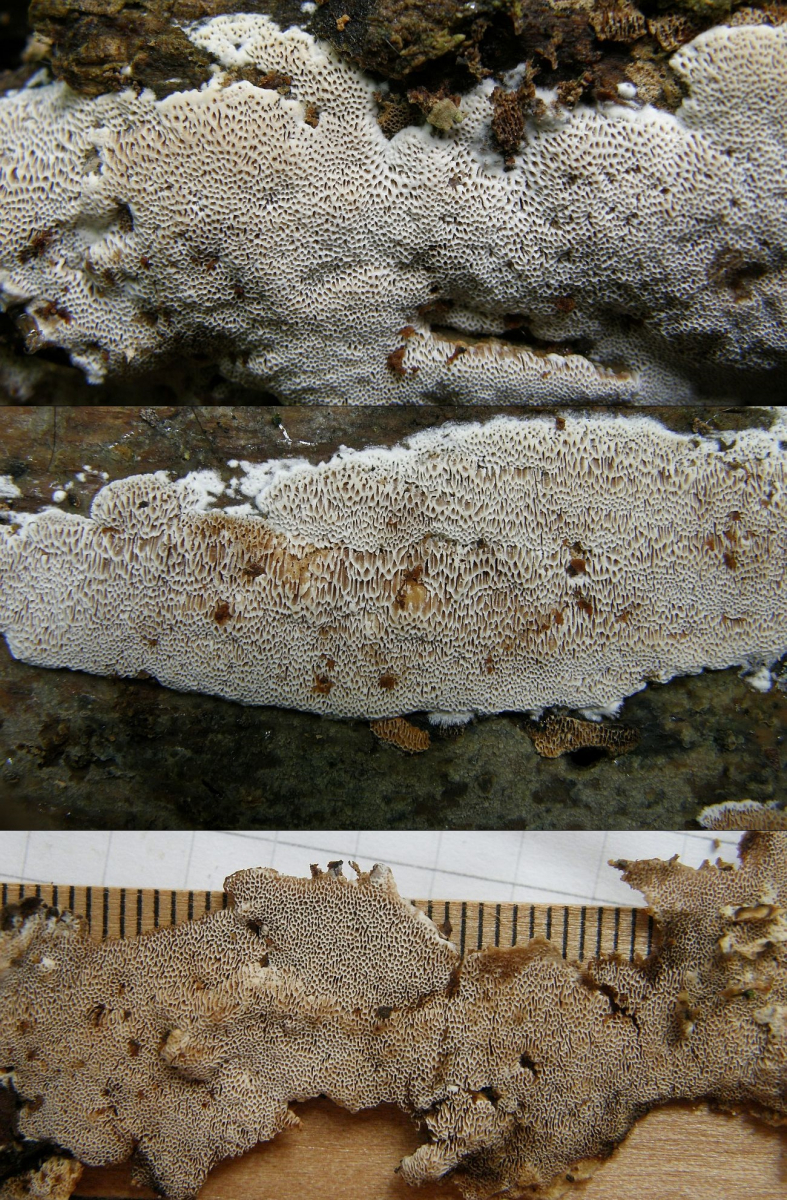 makroskopische Eigenschaften: Fruchtkörper komplett resupinat, dünn, meist kleinflächig und seltener zu ausgedehnteren Belägen zusammenwachsend; normalerweise rein weiß, selten grau, fleischfarben oder ockerlich verfärbend; Subikulum meist nur ein dünnes, wattig-filziges Hyphenlager mit flauschigen bis fein gewimperten Rändern, auf dem sich zunächst flache, unregelmäßig unrunde Einzelporen bilden (cyphelloides Stadium), später mit zusammengewachsenen, unregelmäßigen Poren; rundlich, oval, eckig oder fast sinuos; um 2-4/mm (dazwischen auch mit einigen größeren oder kleineren Poren); Röhren dabei kurz, oft niedriger oder gleich dem Porendurchmesser; Mündungen gerne fein gewimpert; von weicher, frisch wachsartiger Konsistenz, manchmal nahezu –žverschmierbar–œ, trocken brüchig