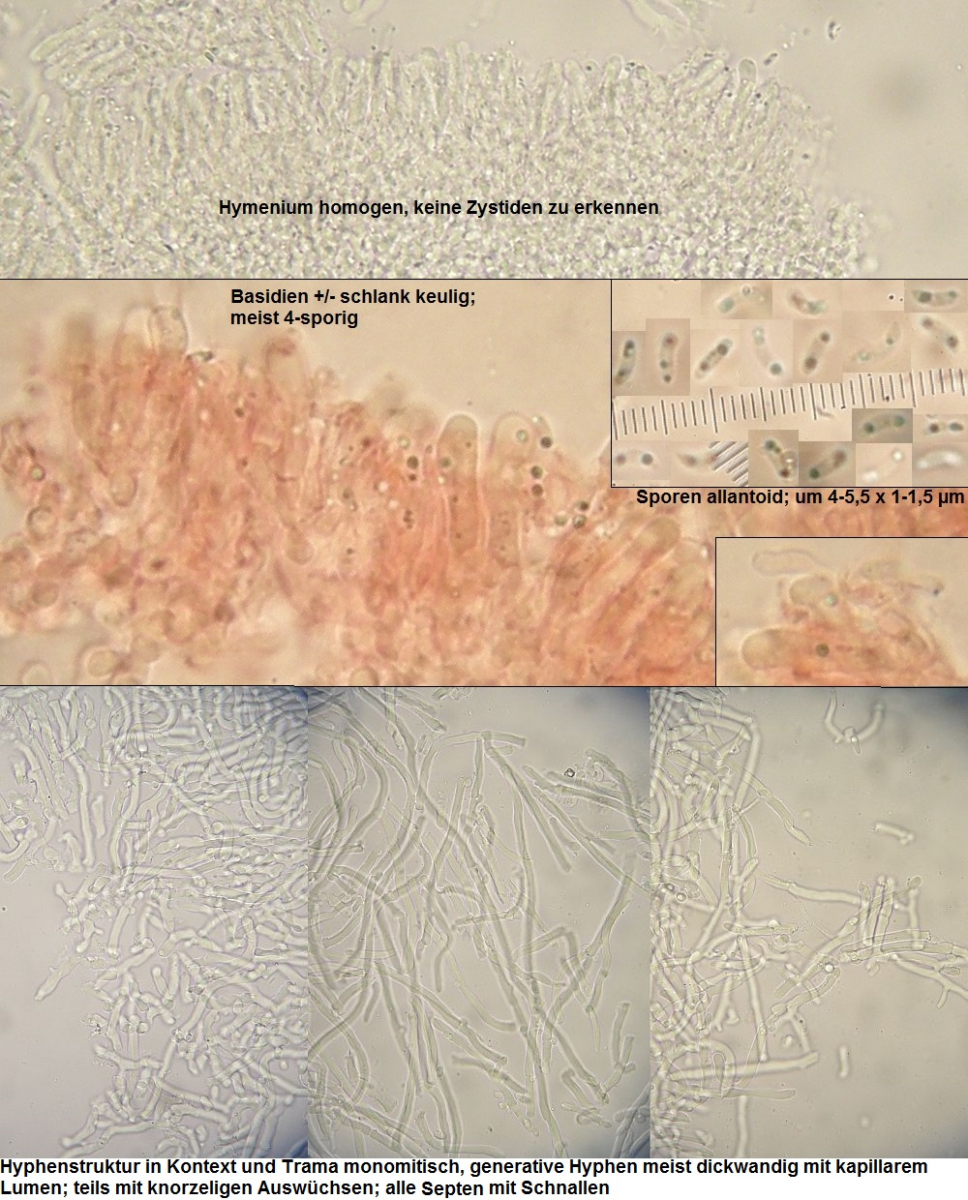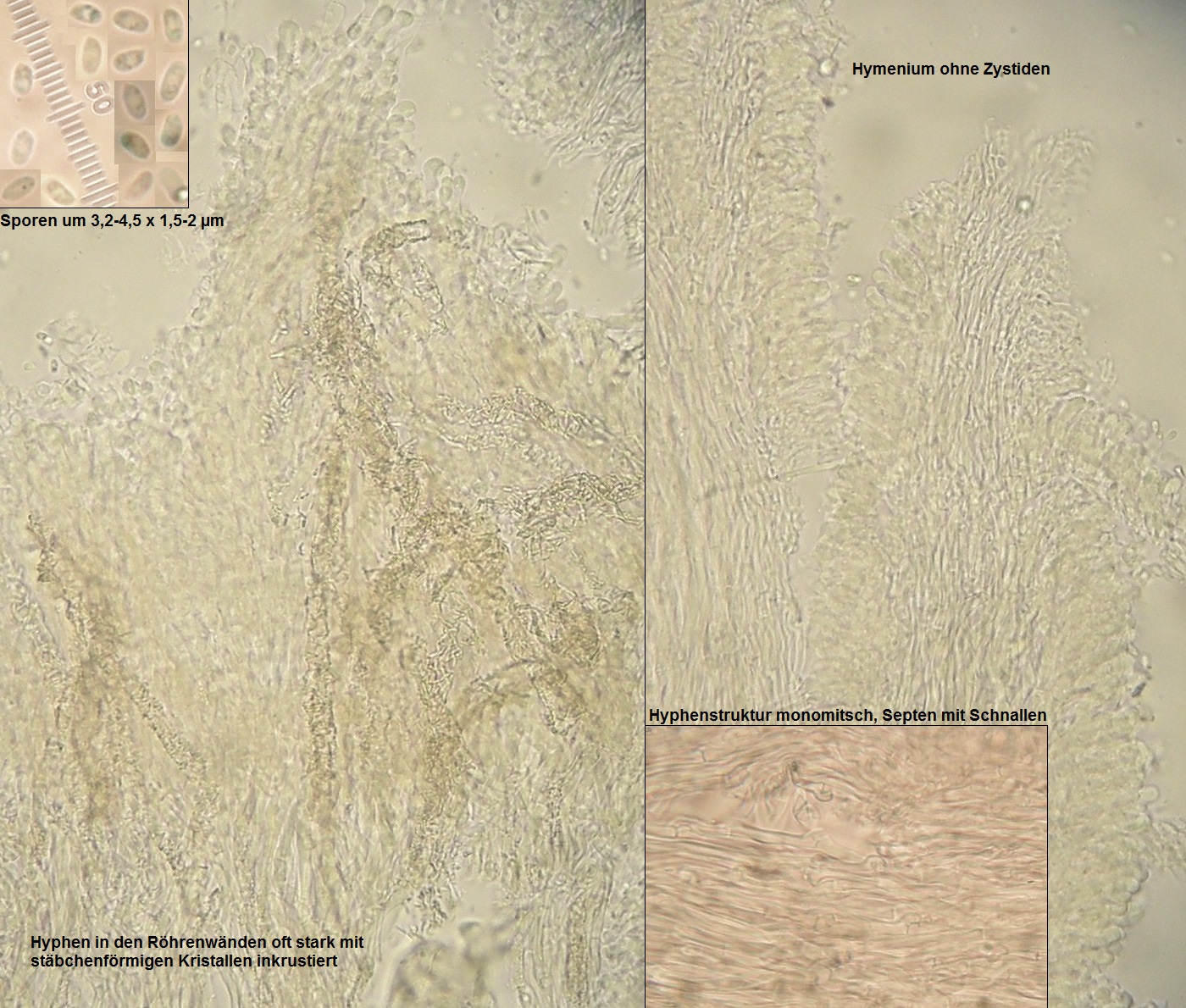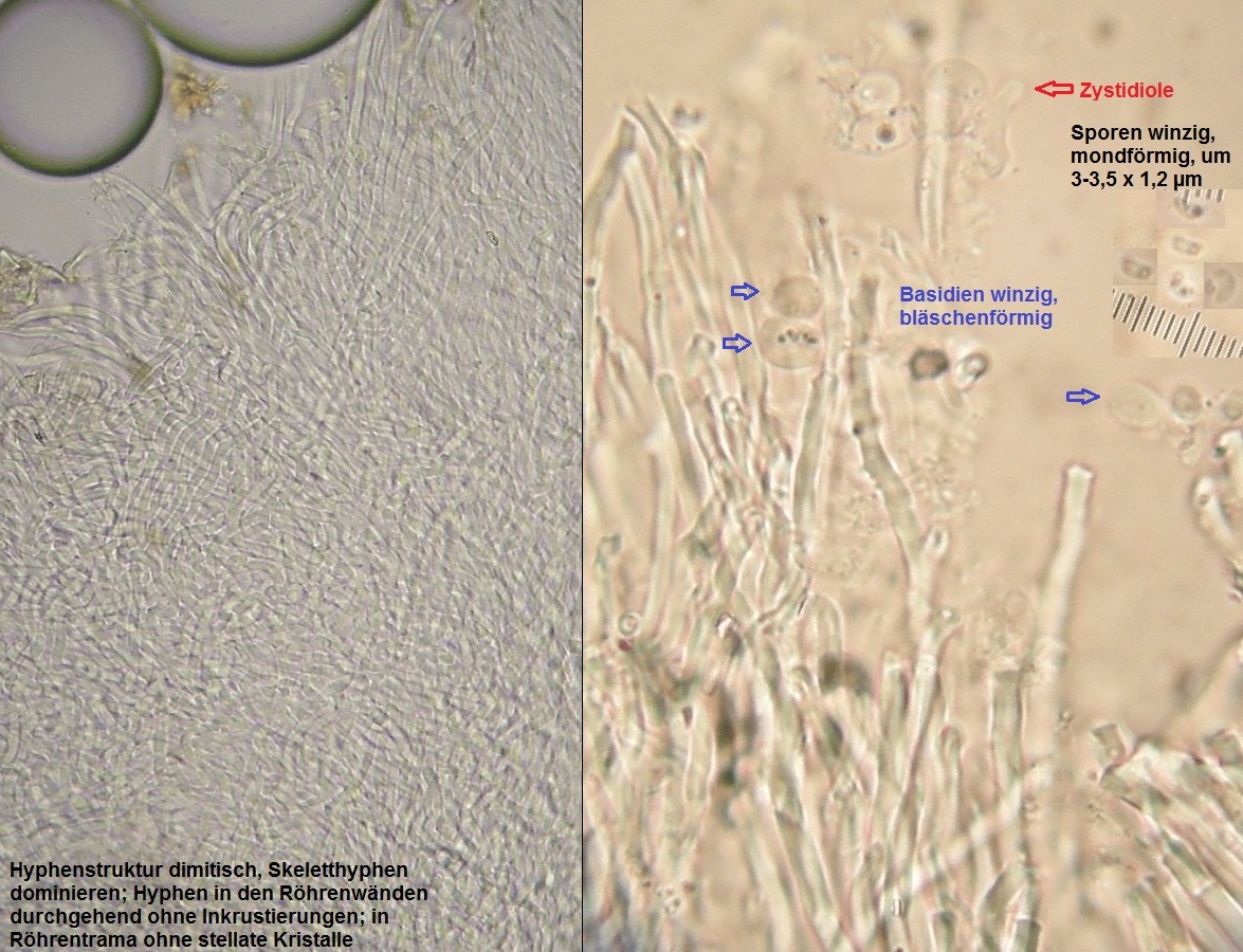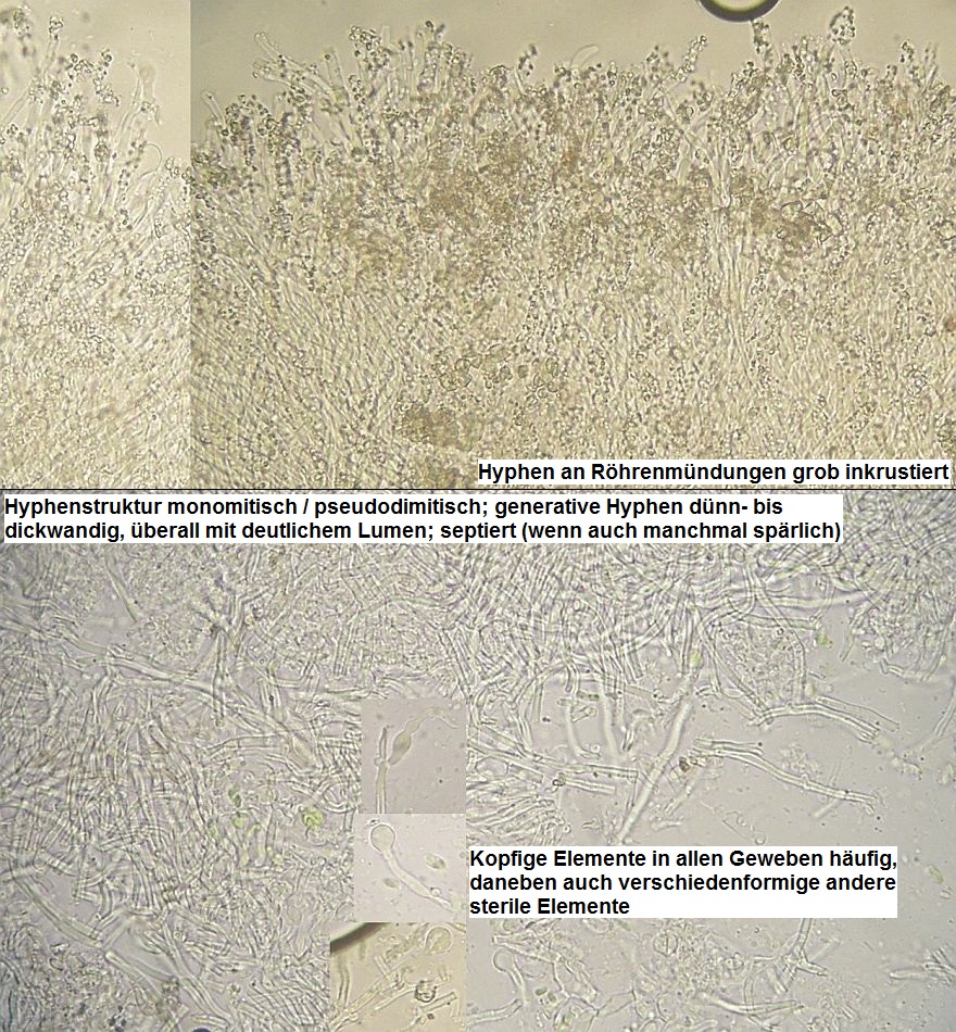 mikroskopische Eigenschaften: Hyphenstruktur monomitisch; alle Septen ohne Schnallen; Hyphen hyalin; in der Röhrentrama vorwiegend dünnwandig und vielfach septiert, im Kontext überwiegend dickwandig, lang durchlaufend mit wenigen Septen (–žpseudodimitisch–œ); in Strängen parallel gebündelt, dazwischen mit mehr verzweigten, gewundenen Hyphen;