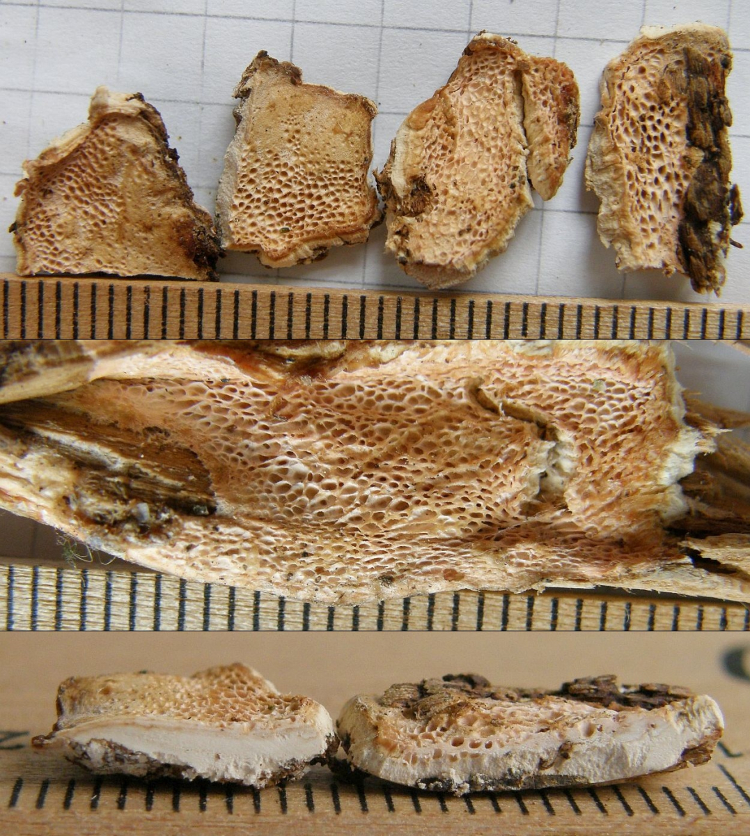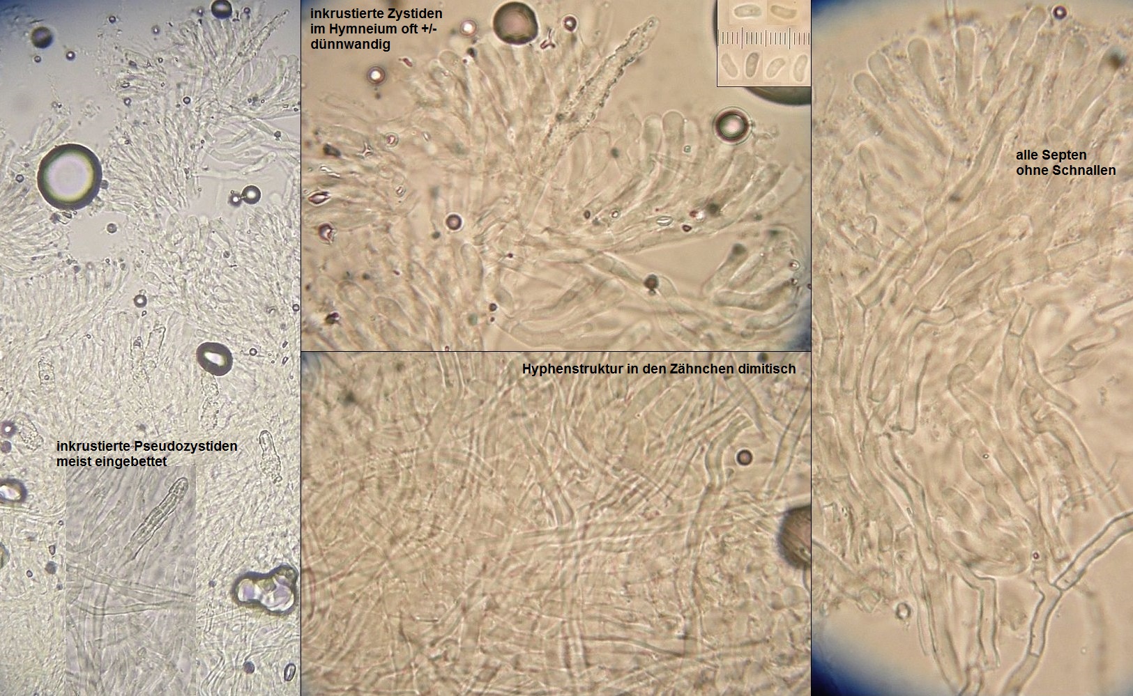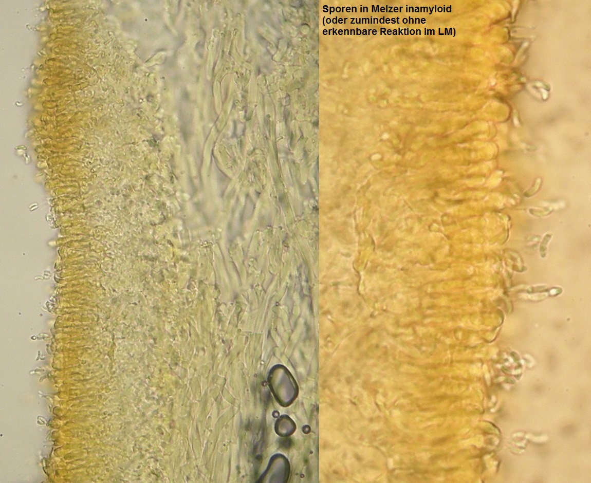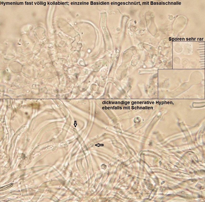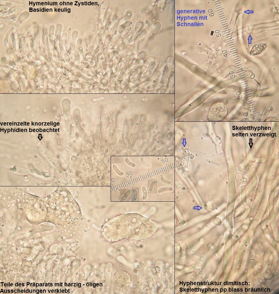 mikroskopische Eigenschaften: Hyphenstruktur monomitisch; alle Septen ohne Schnallen; Hyphen hyalin; in der Röhrentrama vorwiegend dünnwandig und vielfach septiert, im Kontext überwiegend dickwandig, lang durchlaufend mit wenigen Septen (–žpseudodimitisch–œ); in Strängen parallel gebündelt, dazwischen mit mehr verzweigten, gewundenen Hyphen;