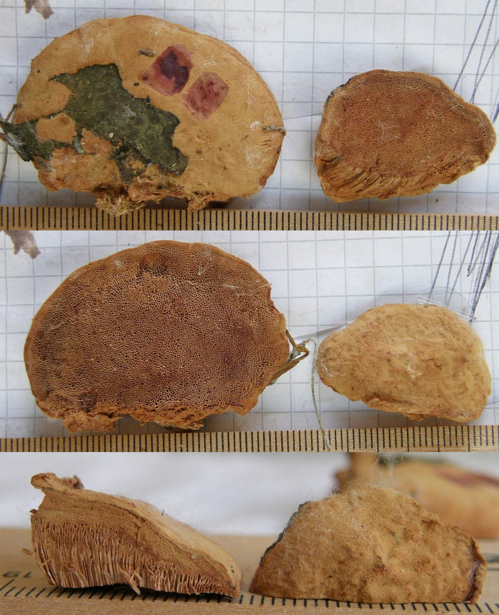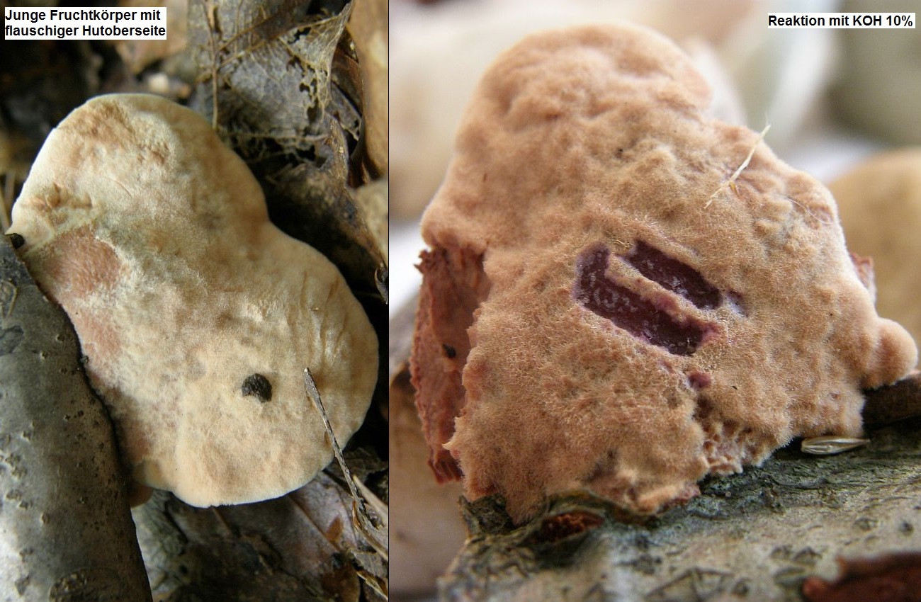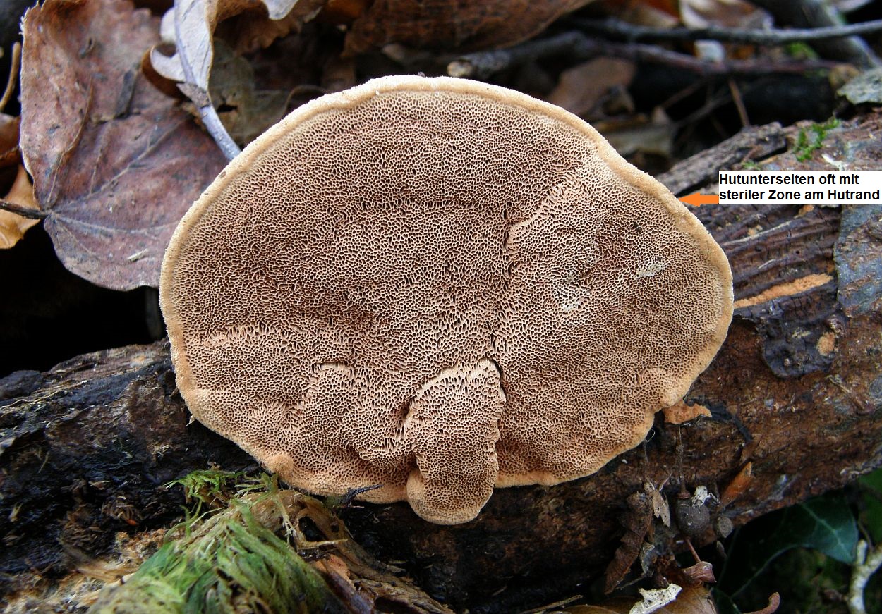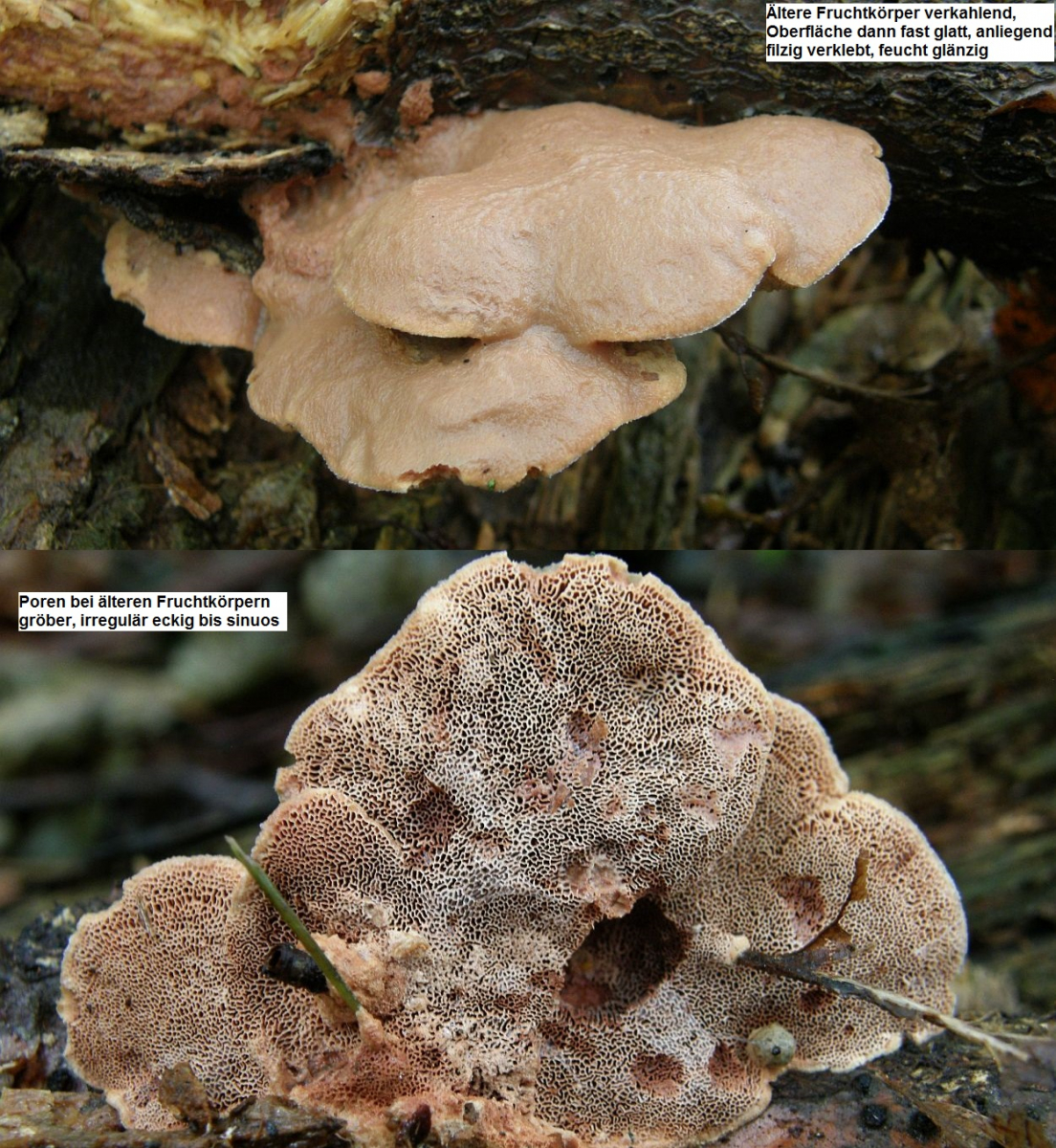 makroskopische Eigenschaften: Fruchtkörper deutlich pileat, an schrägem (überhängenden) Substrat mit mehr oder weniger deutlichen Resupinatanteilen, aber auch an Substratunterseiten mit dem Bestreben zur Hutbildung; stets recht einheitlich gefärbt, hell zimtocker bis zimtbraun; frisch weichfleischig, leicht zerreißbar, getrocknet spröde aber kaum schrumpfend, sehr leicht; Fleischfarben analog zu Hut- und Porenfarben; Hutoberfläche anfangs flauschig –“ filzig, Haare aber bald zusammenklebend und angedrückt, von der Ansatzstelle zum Hutrand hin mehr und mehr verkahlend, zuletzt glatt und feucht glänzig, dabei oft etwas rippig oder gerillt, ansonsten unzoniert; Poren anfangs rundlich bis schwach eckig, 2-4/mm, später mehr und mehr irregulär aufreißend bis sinuos; am Hutrand vor allem jung mit steriler Zone; Geruch unbedeutend, von Kauproben ist unbedingt abzusehen.