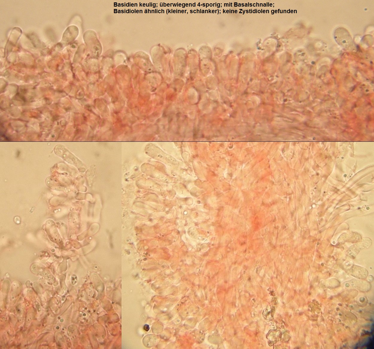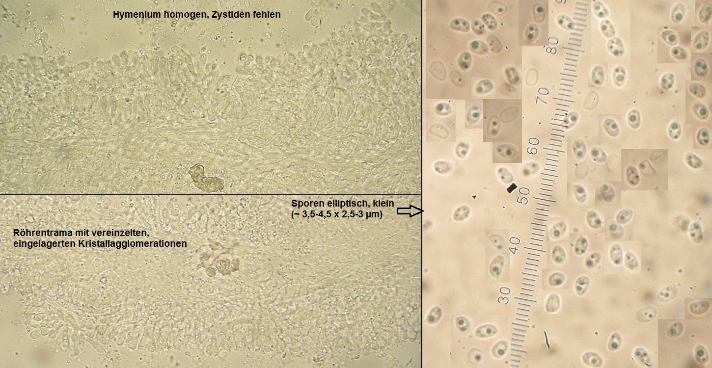mikroskopische Eigenschaften: Hyphenstruktur monomitisch, generative Hyphen dünn- bis dickwandig, Septen mit Schnallen; Zystiden fehlen; Sporen elliptisch, glatt, dünnwandig, inamyloid; um 3,5-5 x 2-3 µm