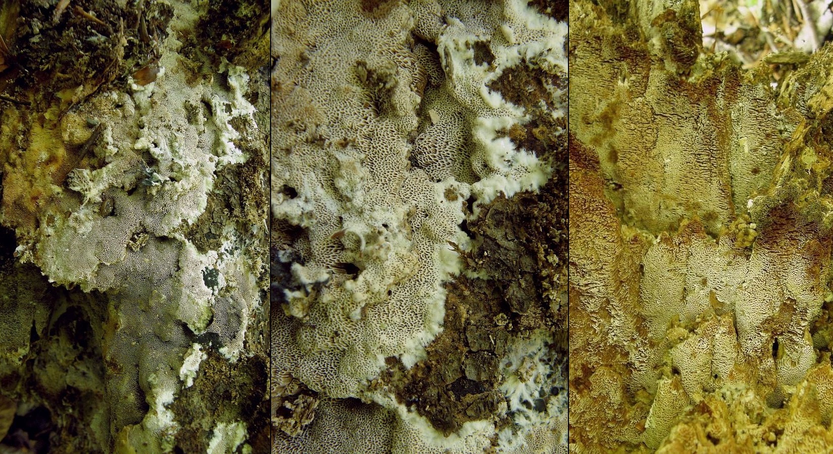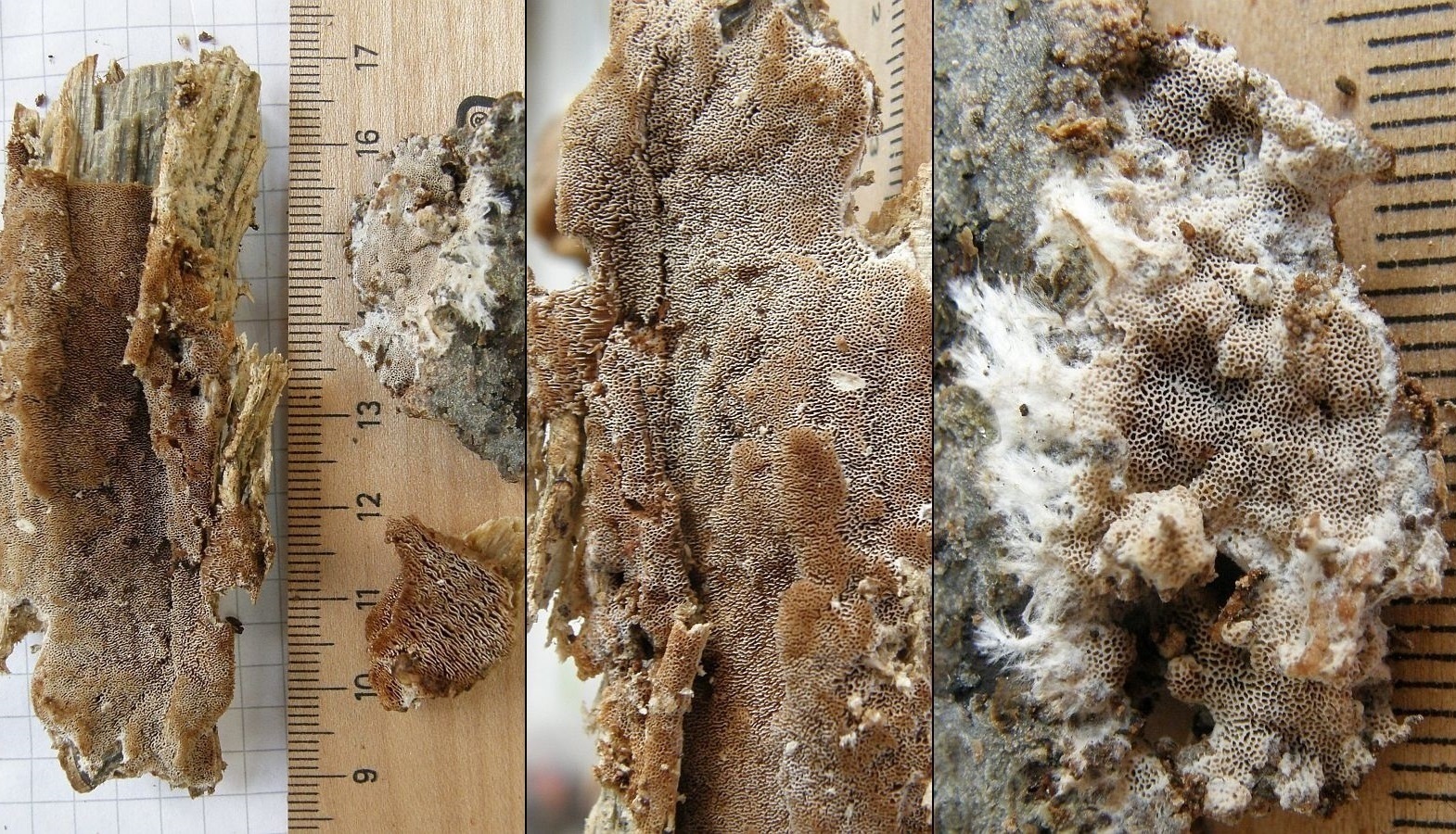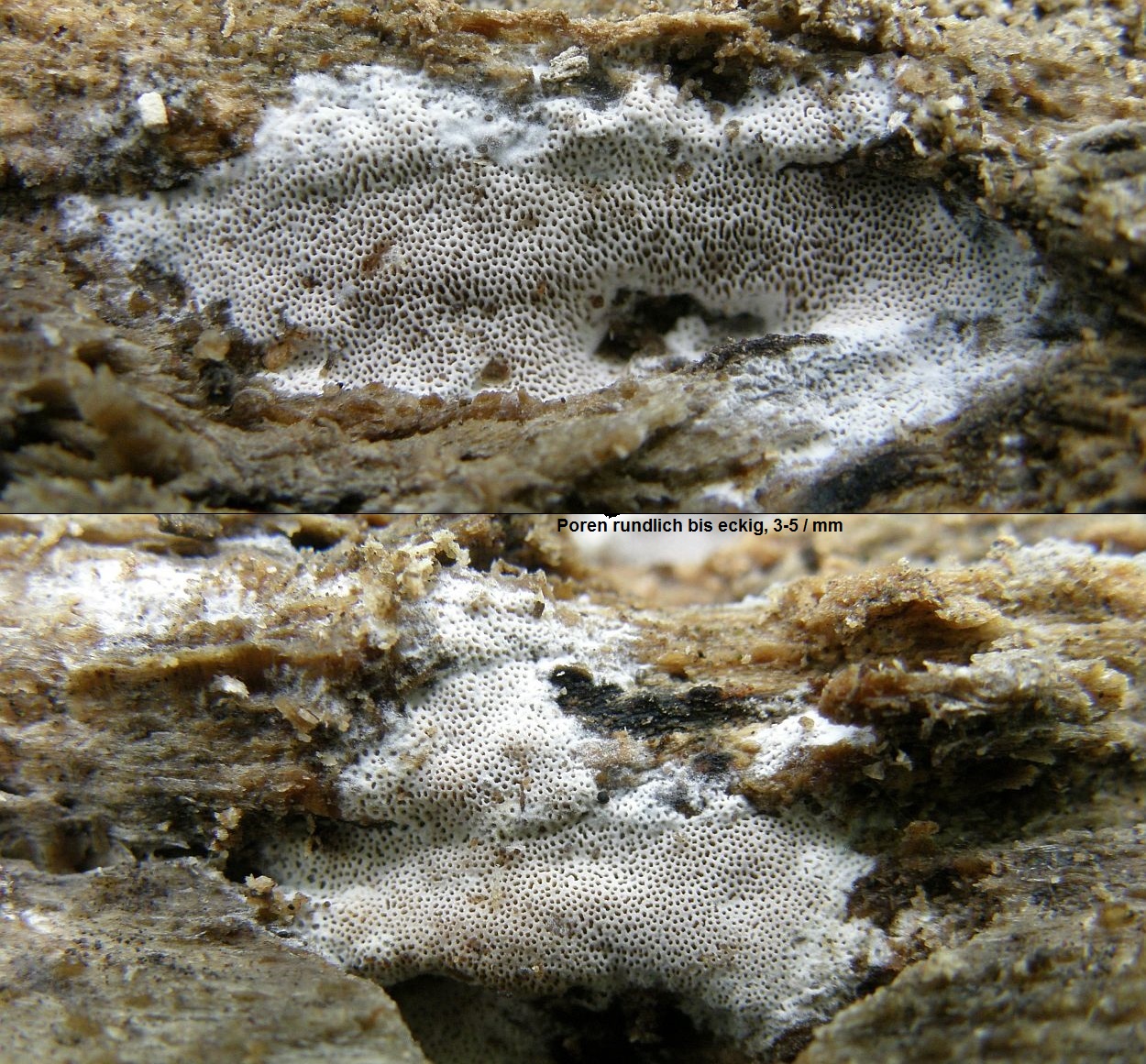 makroskopische Eigenschaften: Fruchtkörper resupinat; anfangs hell, später über trüb cremefarben, altrosa / rosagrau zu graubraun verfärbend, bei Berührung und in der Endphase der Entwicklung schokoladenbraun verfärbend; klein bis großflächig, in der Wachstumsphase oft mit weißen, fransigen Rändern; Poren anfangs klein, ganzrandig, rundlich bis eckig, um 3-5/mm; im Alter auch geschlitzt, langgezogen bis fast sinuos mit unvollständigen Rändern, dann auch etwas größer, in der Breite (bei geschlitzten / sinuosen Poren die Breite messen!) um 2-3/mm; Konsistenz weich, zerreißbar, aber nicht gelatinös oder gallertig, sondern eher ähnlich wie ganz junge, gut durchfeuchtete Trameten.