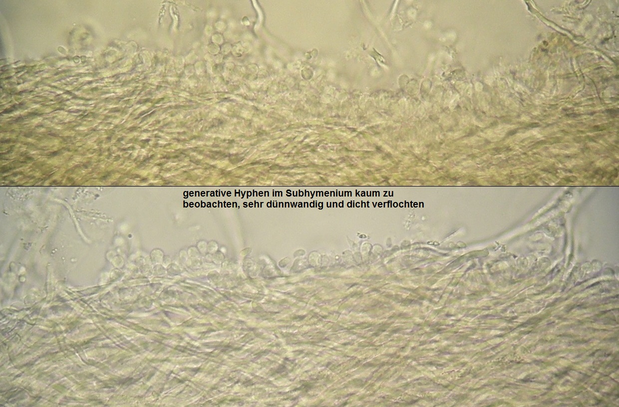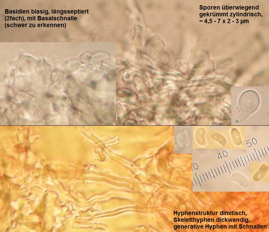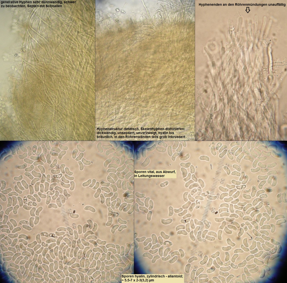 mikroskopische Eigenschaften: Hyphenstruktur dimitisch, Skeletthyphen dominant, unseptiert und weitestgehend unverzweigt, im Alter zunehmend deutlich braun pigmentiert, in den Röhrenwänden oft mit auffälliger, grober Inkrustierung; generative Hyphen unauffällig, sehr dünnwandig, schwer zu beobachten, reich verzweigt und dicht verflochten, Septen mit Schnallen; Basidien kurz keulig, teils fast bläschenförmig, bisweilen gestielt, 4-sporig, zweifach längsseptiert; Sporen zylindrisch –“ allantoid; um 5-7 x 2-3 µm