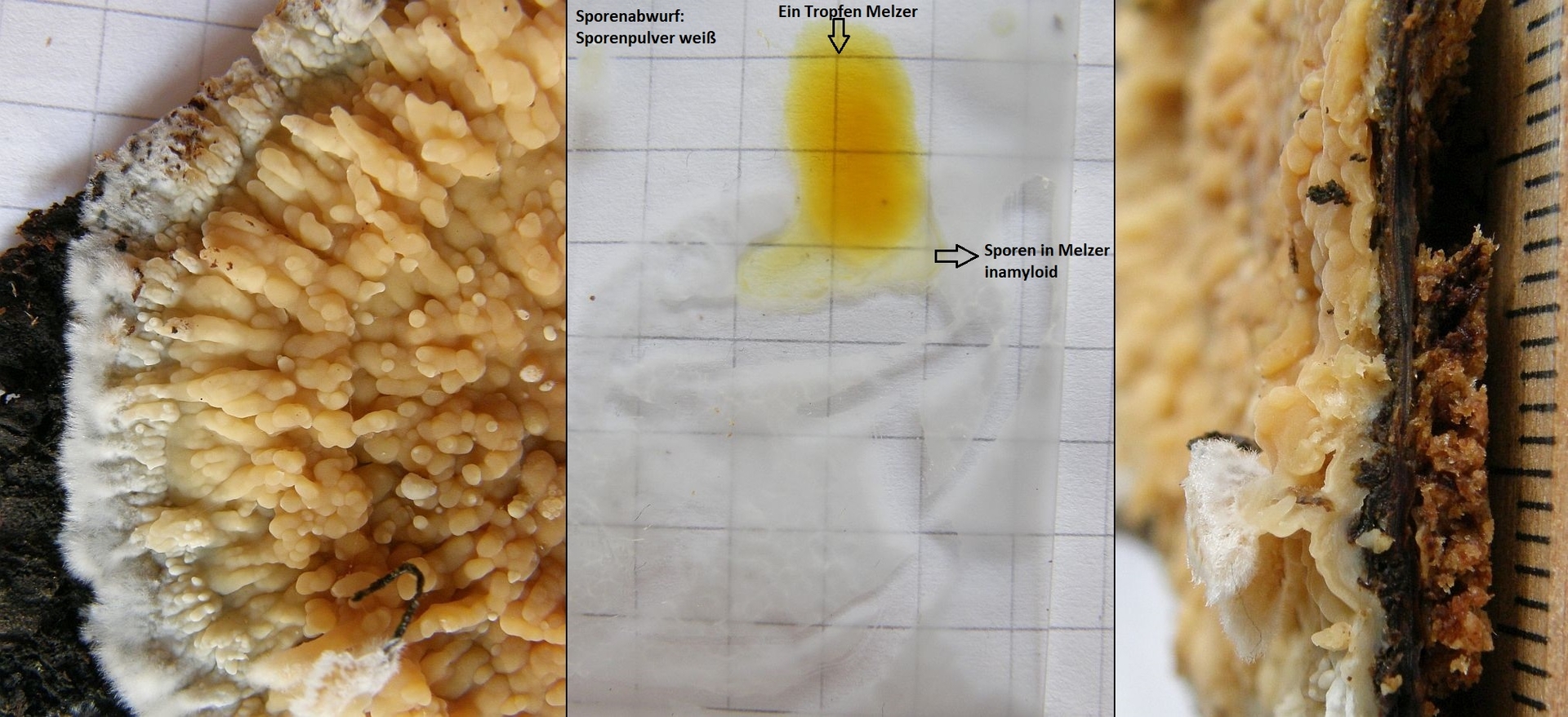 Melzer verwende ich bei Krusten nur um zB die Amyloidität (oder Dextrinoidität) nachzuweisen. Da ist Melzer normalerweise besser als Lugol, weil die "Krustologen" alle mit Melzer arbeiten, und man nicht wie bei Ascos rücksicht wegen der Lethalität von melzer nehmen muss. Bei Hyphoderma ist aber eh alles inamyloid, und eine Hyphoderma dürfte dein Fund auf jeden Fall sein - allenfalls noch eine der großsporigen Phlebia - Arten (Phlebia albida sieht ähnlich aus!), aber bei Phlebia ist auch alles immer inamyloid.