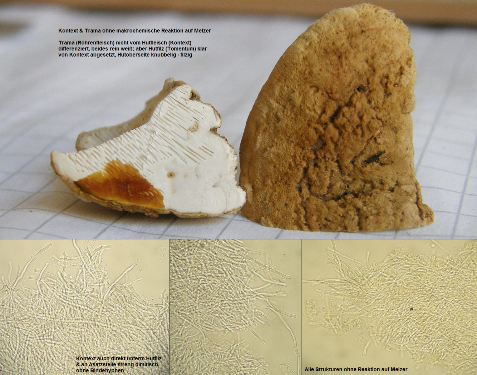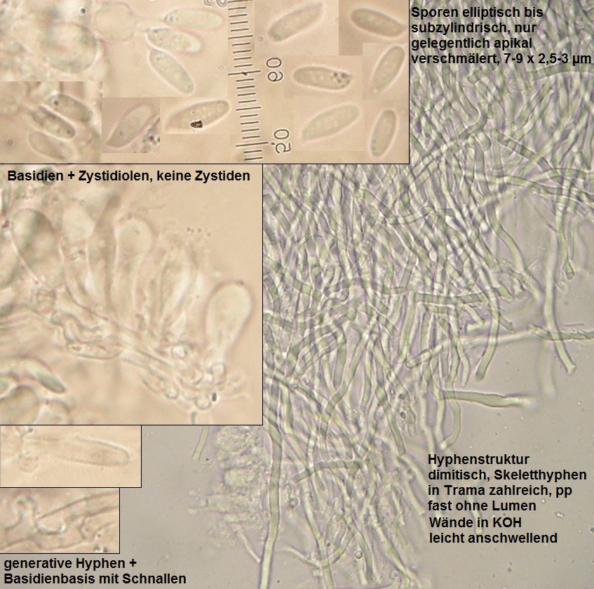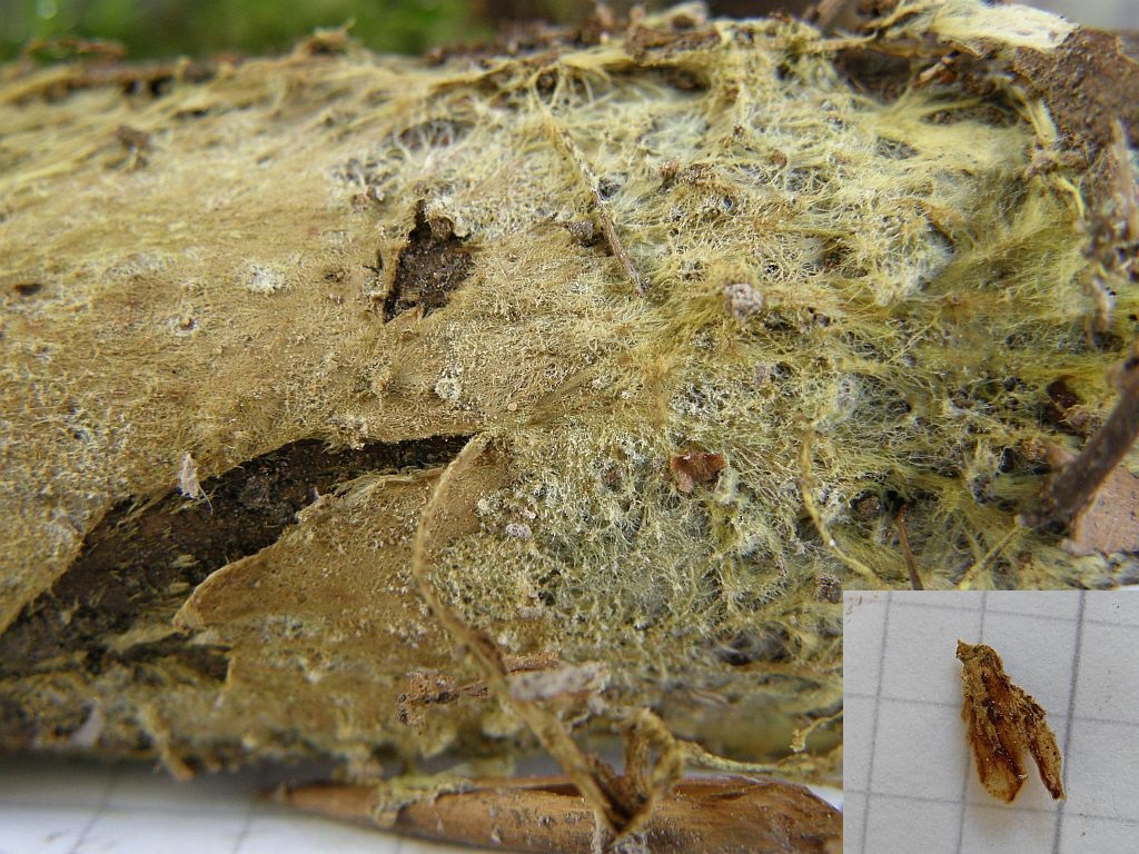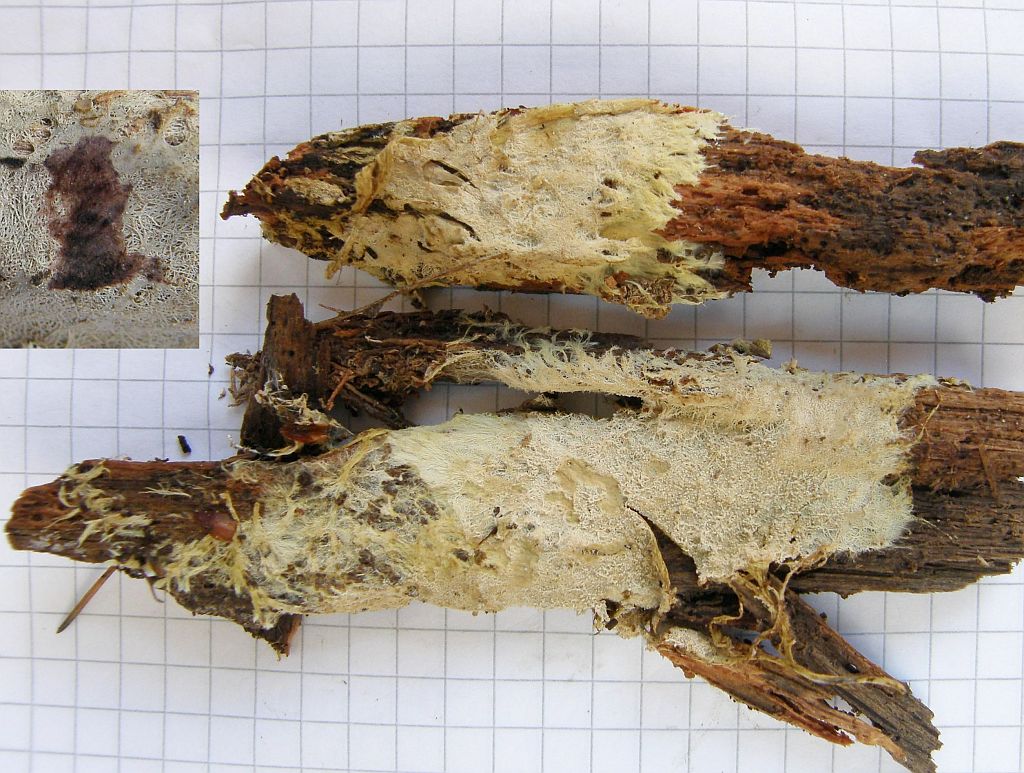 Der dünne, weiße Flausch daneben ist auch was Anamorphes. Sieht aus wie ein Haplotrichum (Anamorphe von Botryobasidium), aber ich kann es nicht bestimmen.