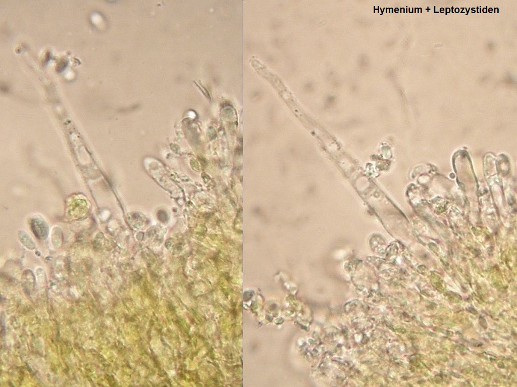 mikroskopische Eigenschaften: Hyphenstruktur monomitisch, Septen überall mit Schnallen; Hyphen im Subikulum parallel zum Substrat, dünn- bis schwach dickwandig, gelegentlich etwas gelifiziert; im Subhymenium dicht verflochten und verklebt, aufsteigend, mit vereinzelten Kristallen durchsetzt, teilweise mit Öltröpfchen; im Hymenium mit spindeligen, zuspitzenden Leptozystiden (dünnwandig, ohne Inkrustierungen); Basidien schlank keulig in dichter Palisade; Sporen elliptisch bis subzylindrisch, glatt, dünnwandig, inamyloid, vital mit refraktärem Inhalt aus teilweise zu größeren Gebilden zusammenfließenden Tropfen; um 4,5-7 x 2,2-3 µm (eigene Messungen)