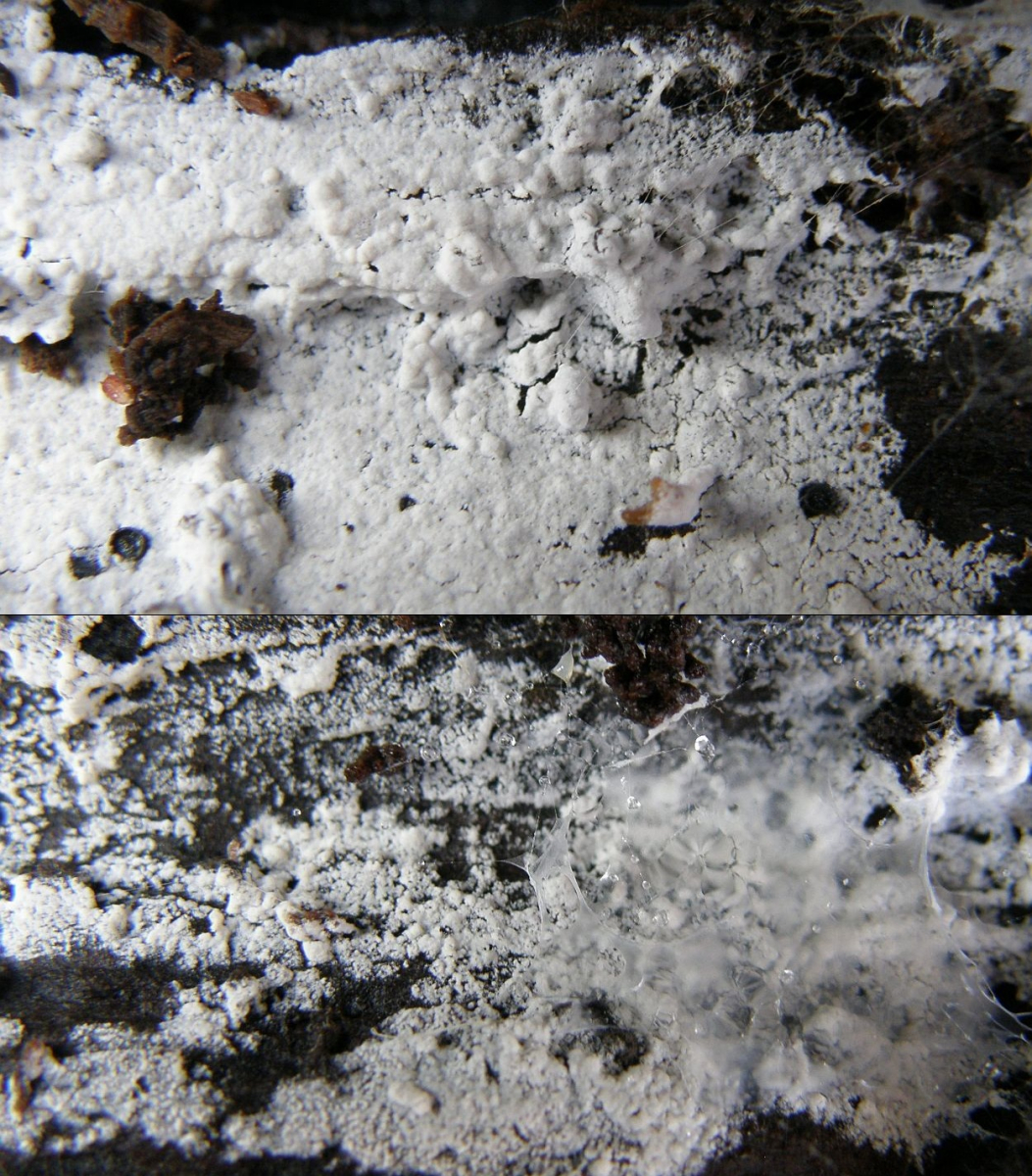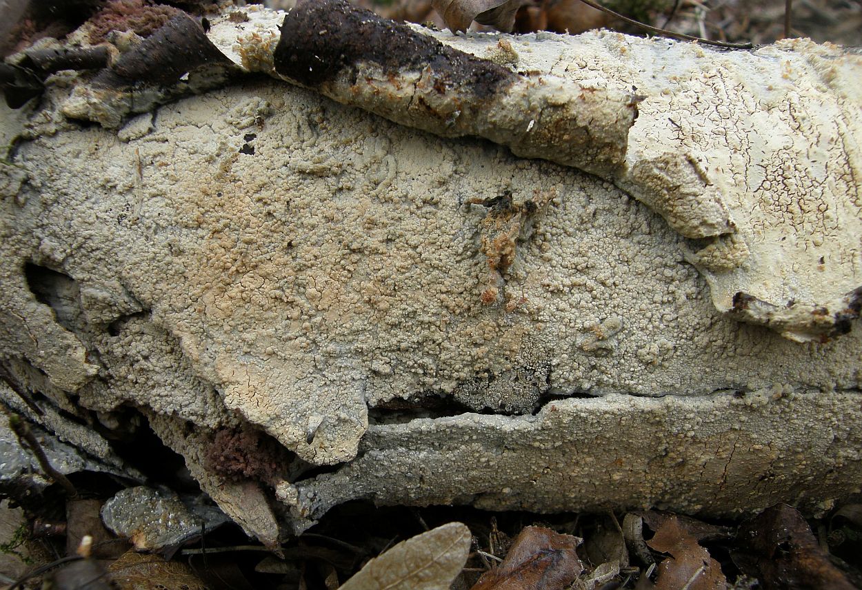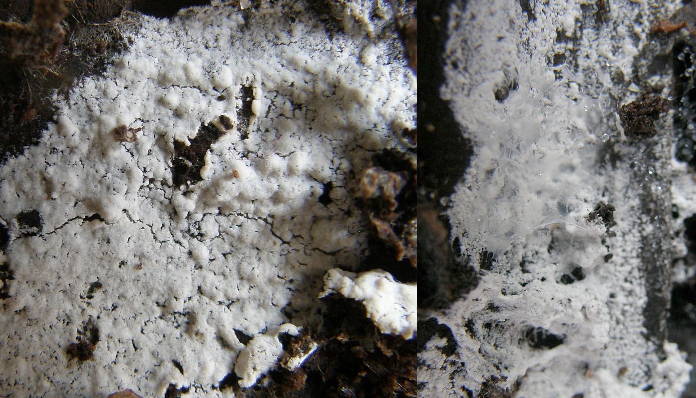 makroskopische Eigenschaften: Fruchtkörper dünn, weißlich (auch getrocknet), als locker zusammenhängende Häutchen, die zumindest stückchenweise gut vom Substrat ablösbar sind; Oberfläche glatt, auch etwas mehlig wirkend; ohne (makroskopisch) erkennbares Subikulum, ohne differenzierten Rand oder Rhizomorphen.