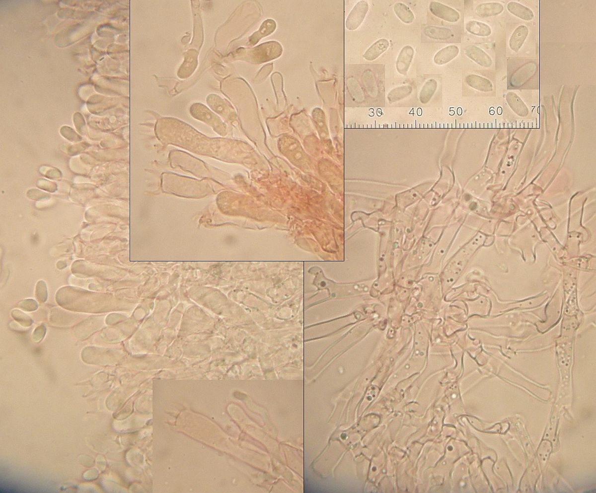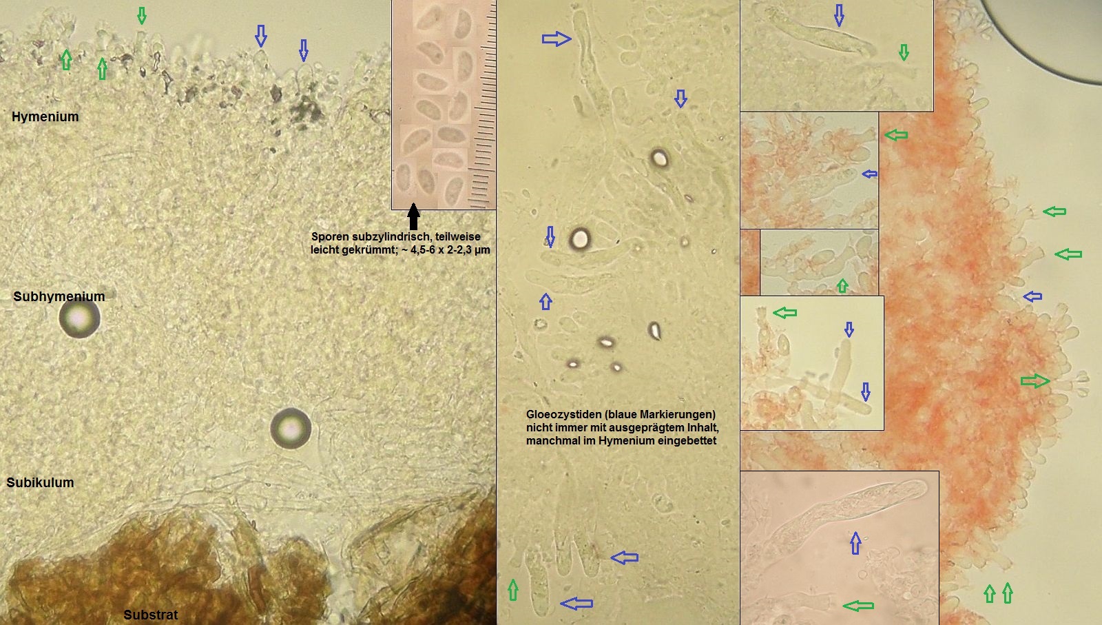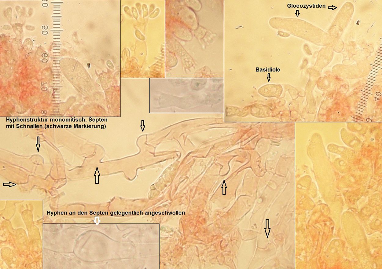 mikroskopische Eigenschaften: Hyphenstruktur monomitisch, Hyphen hyalin, meist dünnwandig, oft mit Öltröpfchen im Plasma, Septen mit Schnallen, an den Septen auch gelegentlich angeschwollen; Gloeozystiden unregelmäßig zylindrisch mit bisweilen schlecht erkennbarem, hyalinem oder gelblichem Inhalt (in KOH3%); Basidien reif urnenförmig mit (2-)4-8 Sterigmen und Basalschnalle, unreife Basidien (Basidiolen) auch blasig; Sporen hyalin, dünnwandig, glatt, inamyloid, subzylindrisch und gelegentlich etwas gekrümmt