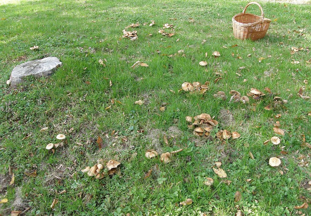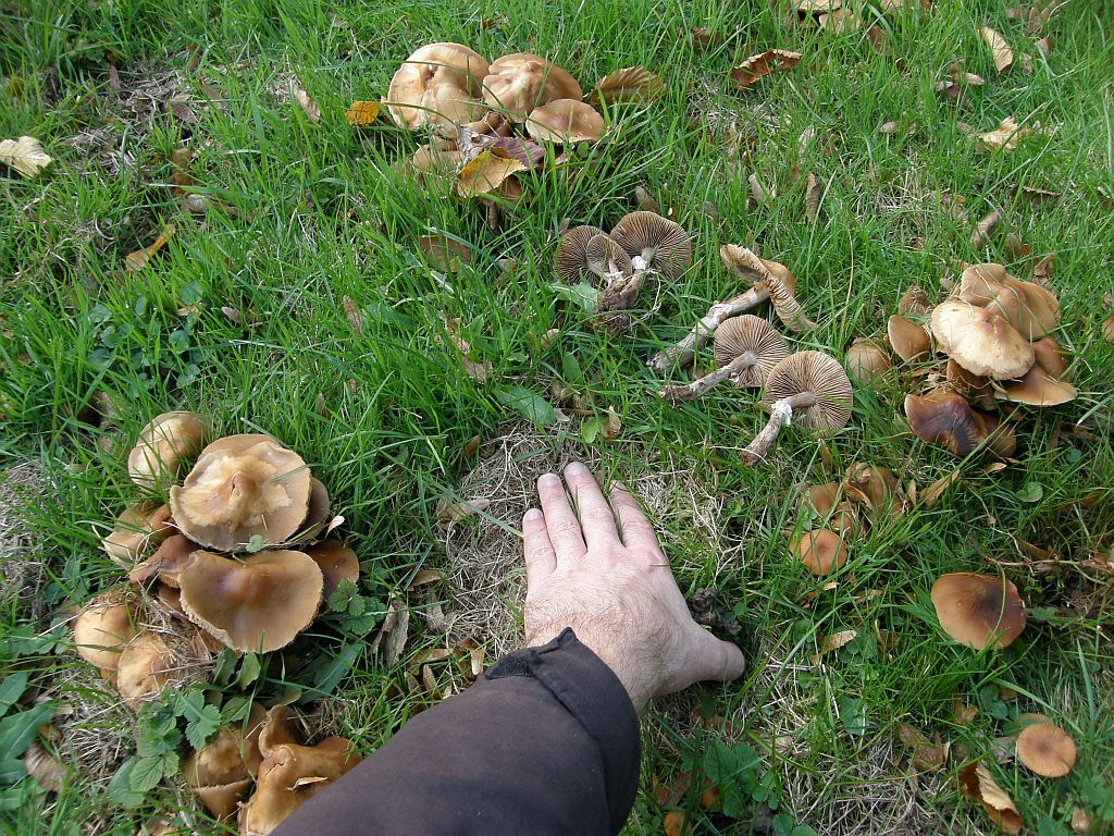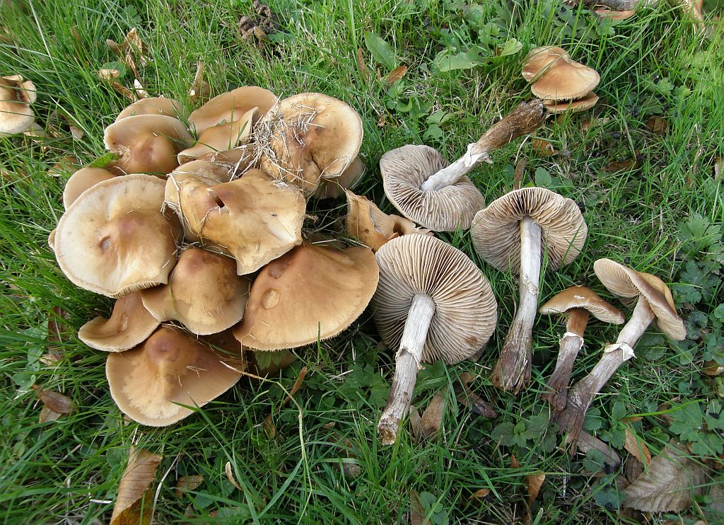 Zusammen mit dem stark büscheligen Wuchs um einen alten laubholzstumpf herum, der Größe und dem bleibend milden, angenehmen Geschmack (ohne mehlgurkige Komponente täte ich da beim Südlichen bleiben. Aber die weiter unten auf dem gelände, das waren schon klare Laberbraune (Agrocybe erebia).