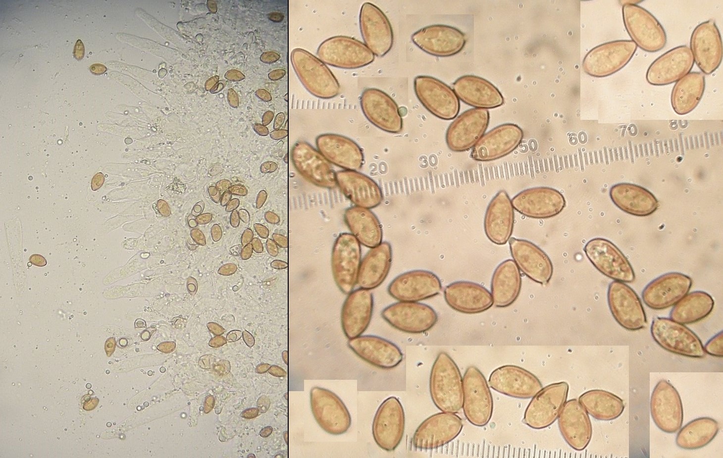 Ist doch nicht so ganz einfach, wie ich gehofft hatte, den mikroskopisch von Agrocybe erebia abzugrenzen. Daß die Sporen teils einen keimporus haben, sollte wohl noch das beste Merkmal sein. Auch sollten die Sporen mehr elliptisch als spindelig sein, hier sind sie beides. Also elliptisch bis zugespitzt / spindelig. Aber ein keimporus ist meist gut zu sehen (und schwer abzubilden), teils wohl wegen der Reife sogar ausgestülpt. Cheilos habe ich noch im Bild, gelegentlich auch Pleuros vorhanden (Form ähnlich), Basidien überwiegend zweisporig, gelegentlich aber mit viersporigen untermischt.